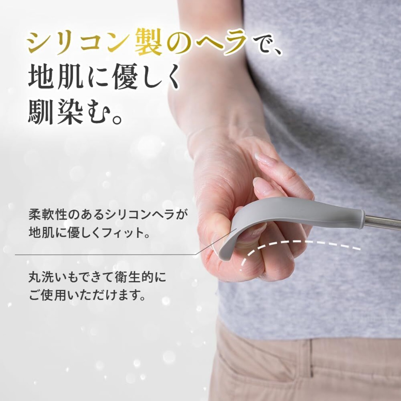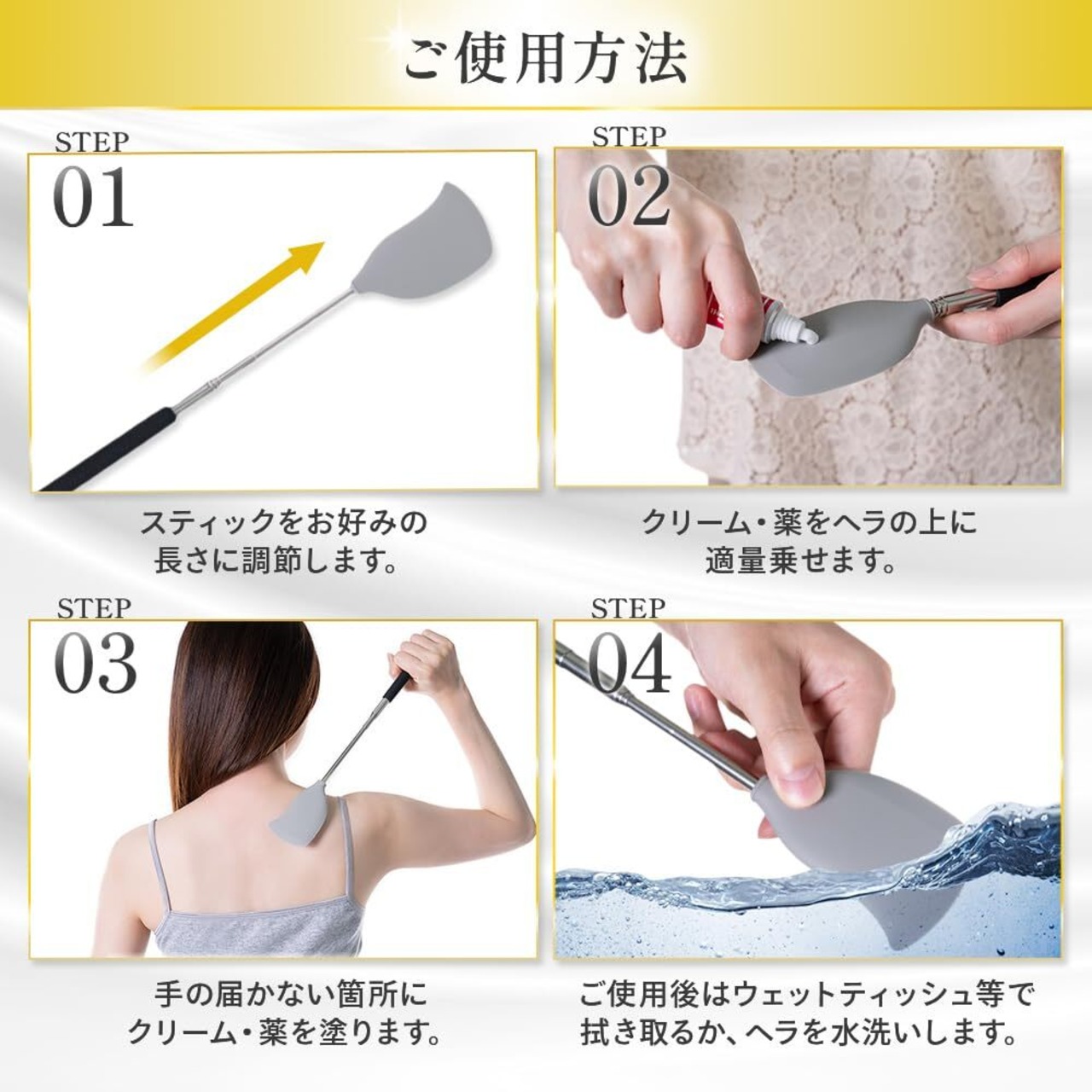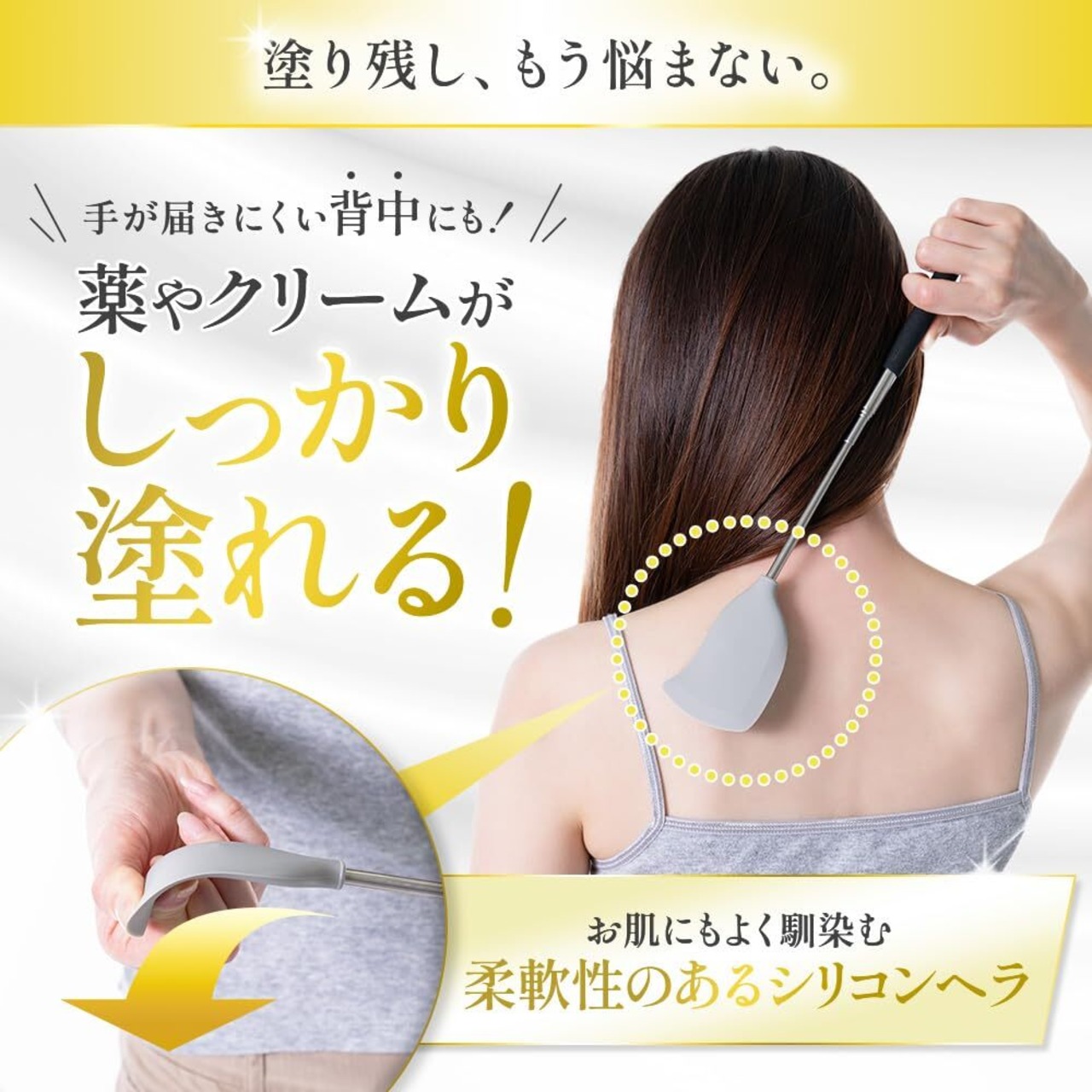 背中の手が届かない所に、薬 軟膏 クリーム ローションをピンポイントで塗ることが出来る道具です。地肌にスベスベと心地よいシリコン素材を採用。ご使用後は丸洗いも出来て衛生的です。