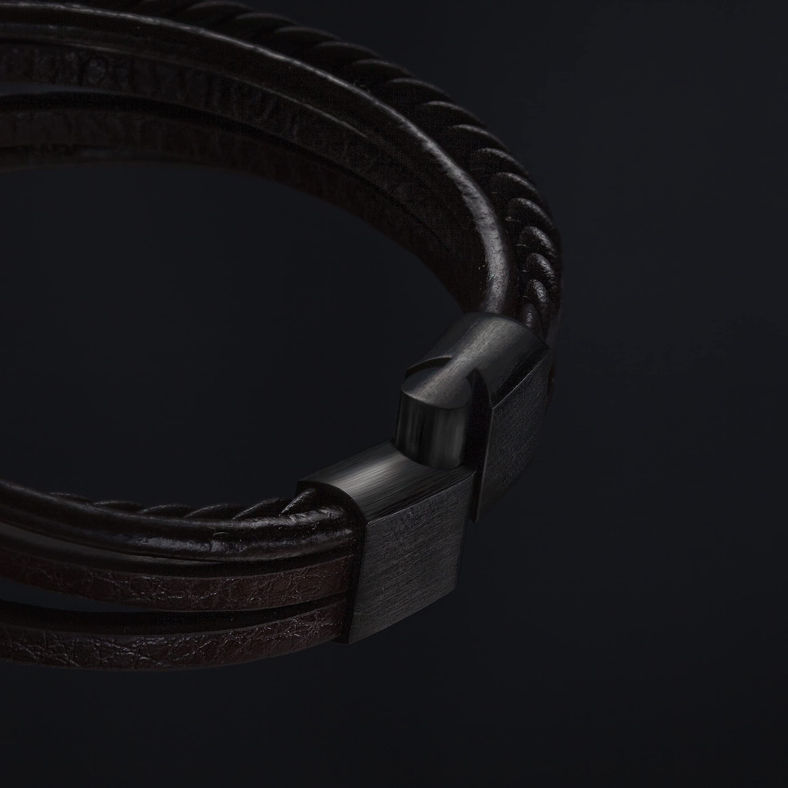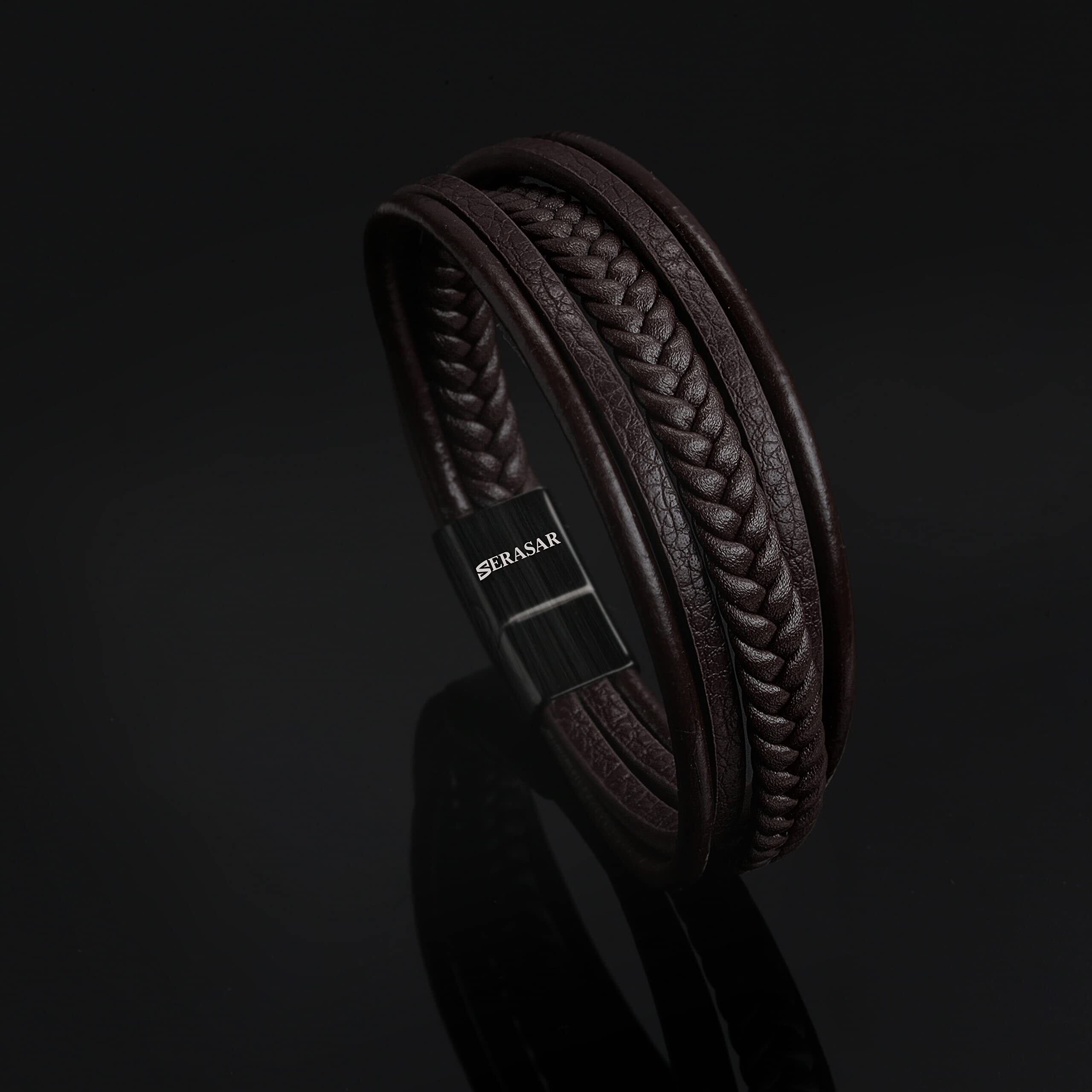 【新着商品】SERASAR | ブラック&ブラウンメンズプレミアム本革ブレスレット「Braid」、ステンレススチールマグネットクラスプ、ジュエリーボックス付き