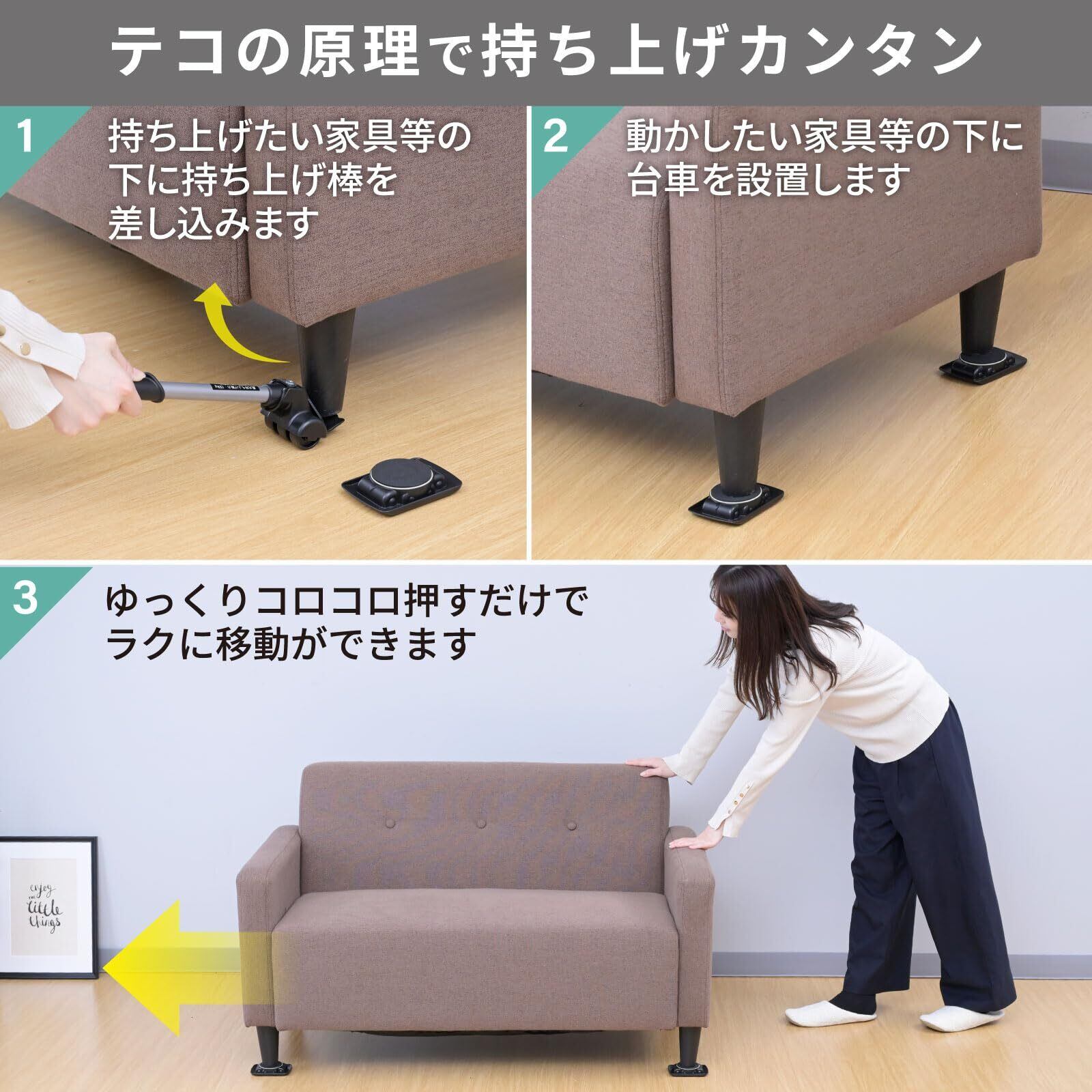 【大型家具も軽々】テコの原理を利用して、重たい家具も約5分の1の力で持ち上げることができます。持ち上げ棒の差し込み部分は先端にかけて薄くなっており、少しのすき間にもしっかり入ります。