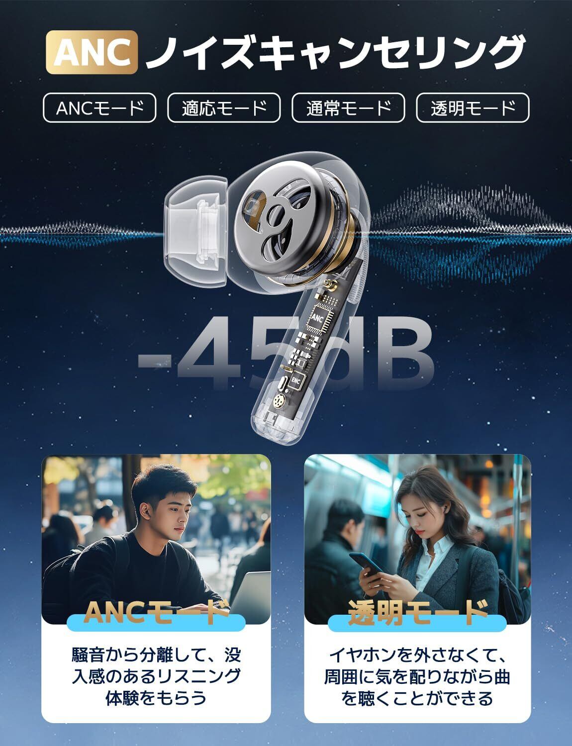 独自開発したプロ級ノイズキャンセリングチップが実現する36dBの高深度ノイズ低減!さらに適当なイヤーピース装着で驚異の45dBまで向上 電車の騒音もオフィスのざわめきも、環境に相応しい遮断モードを選択したら、音楽に没頭しながらも、大切な聴覚を守って、安全性も確保【3モード使い分けでシーン別ピッタリ】①ANCモード:勉強/仕事時に邪魔な雑音をシャットアウト②外音取り込みモード:駅アナウンスや友達の声を自然にキャッチ③環境適応モード:周囲環境を自動感知して賢く切り替わり「ただ遮断するだけじゃない」次世代型 ブルートゥース イヤホン が、あなたの日常生活をよりスマートにレベルアップ! 音楽好きにもビジネスパーソンにも、まさに理想の1台 ぶるーとゅーす イヤホン がここに誕生しました!