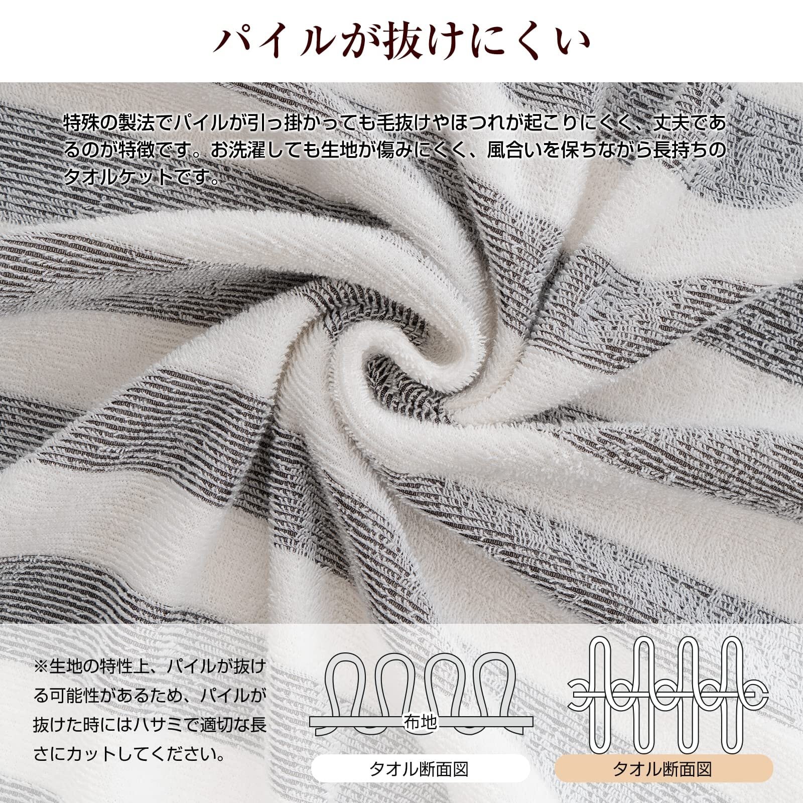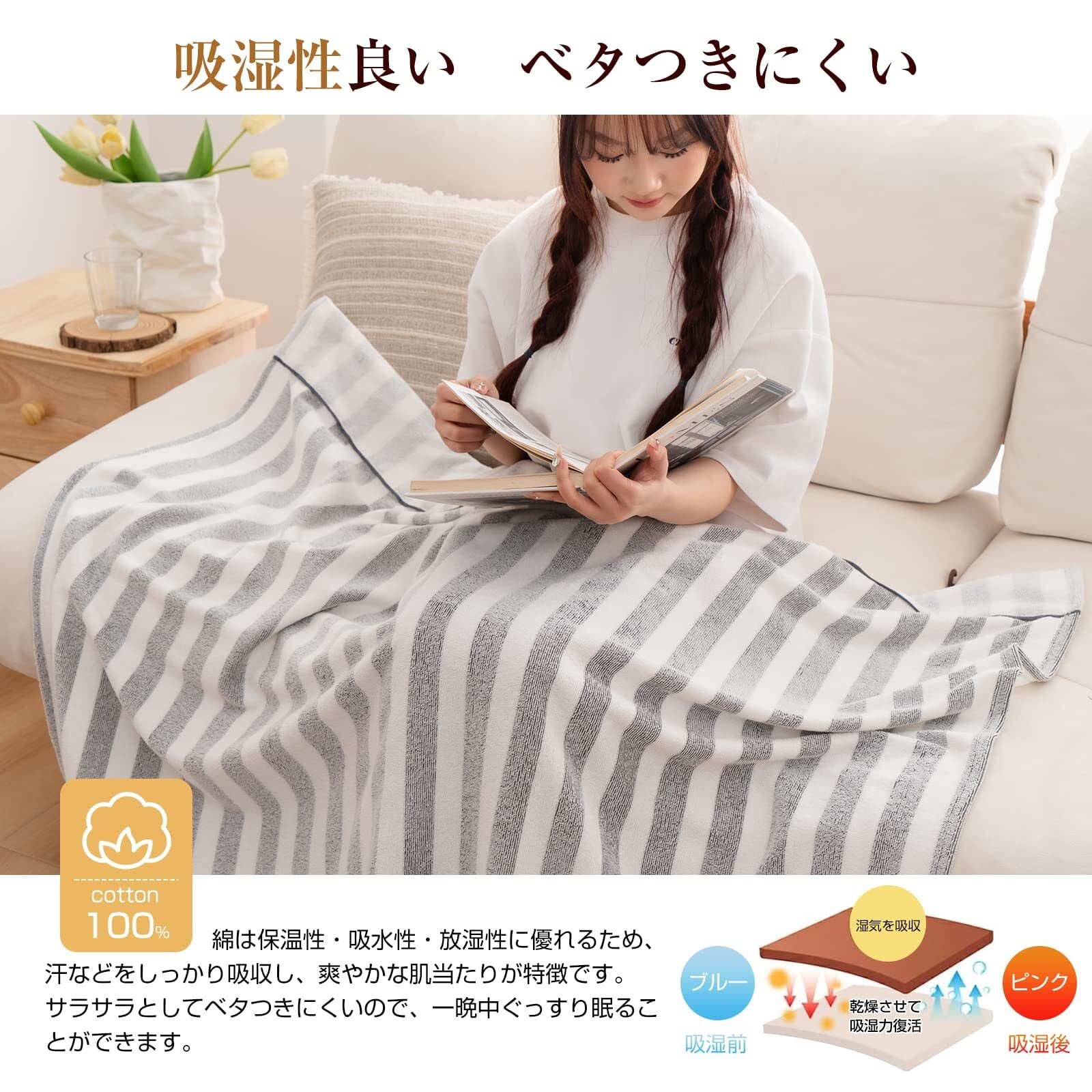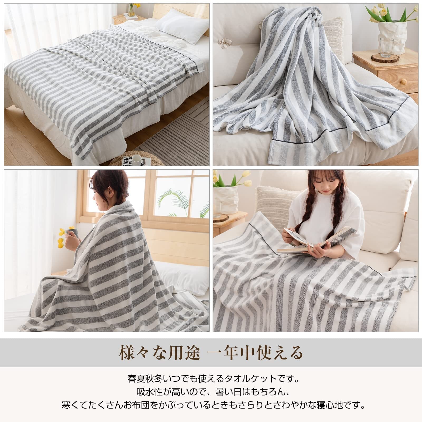 【オールシーズン・様々な用途】肌掛けのコットン素材なので、一年中お使いいただけます。汗ばむ季節は吸水性があるのでサラッと快適で、冷房の効いた部屋での毛布としてもお使いいただけます。肌寒い季節はパイルが程よく空気を含んであたたかく、毛布の代わりに布団のインナーとしても使えます。また、シーツとしても適しています。 ホームだけでなく、温泉・旅行・お花見などいろいろなシーンで大活躍します。自分が使うだけではなく、同僚、上司、お客様へのお礼、友達祝い、親孝行、祝日のギフトにもおすすめです。