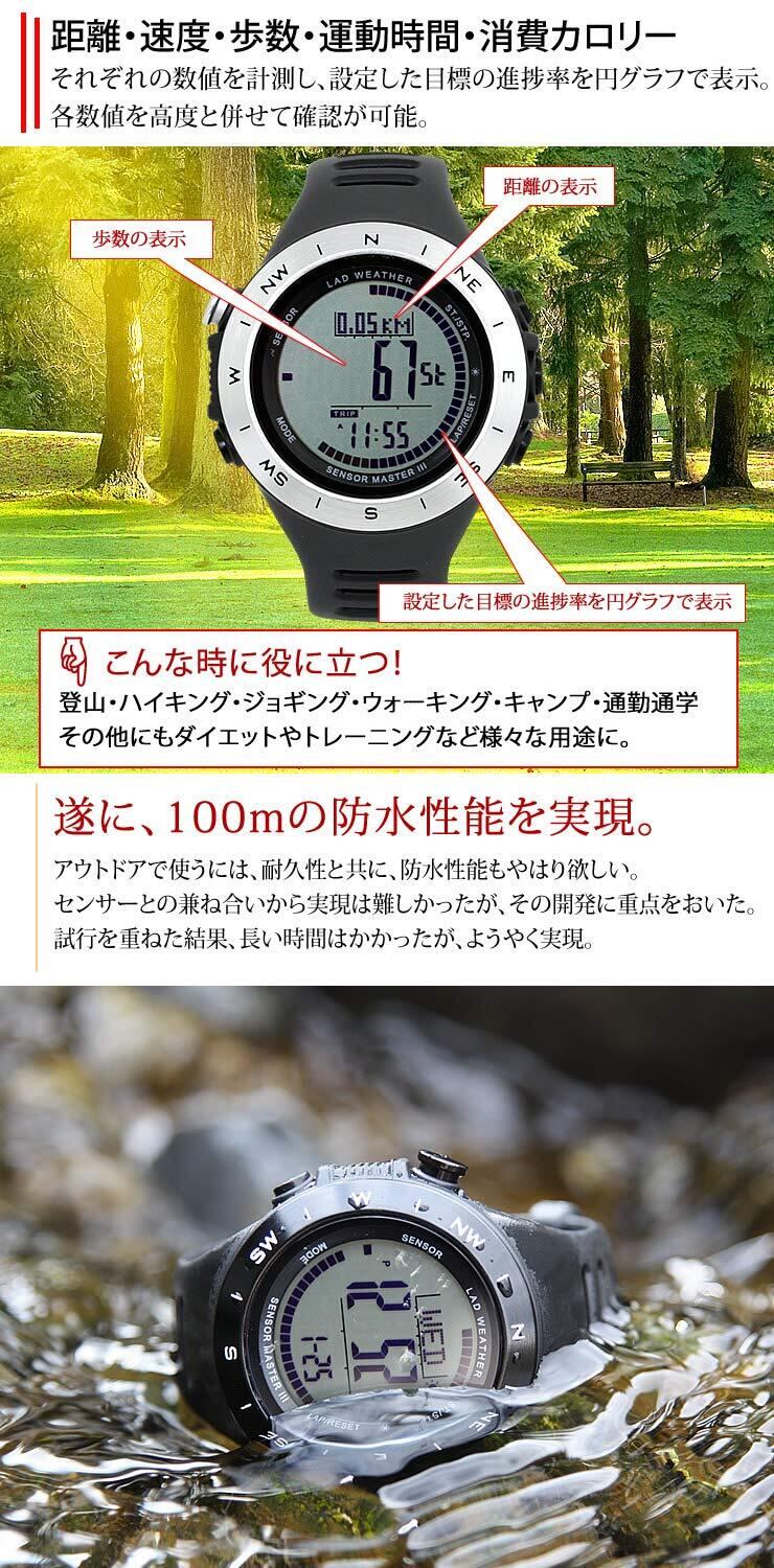 機能一覧:気圧計、高度計、気温計、デジタルコンパス、天気予測、活動量計、距離、速度計、歩数計、運動時間、消費カロリー表示、100m防水、ワールドタイム、タイマー、アラーム、時報、バックライト、サマータイム