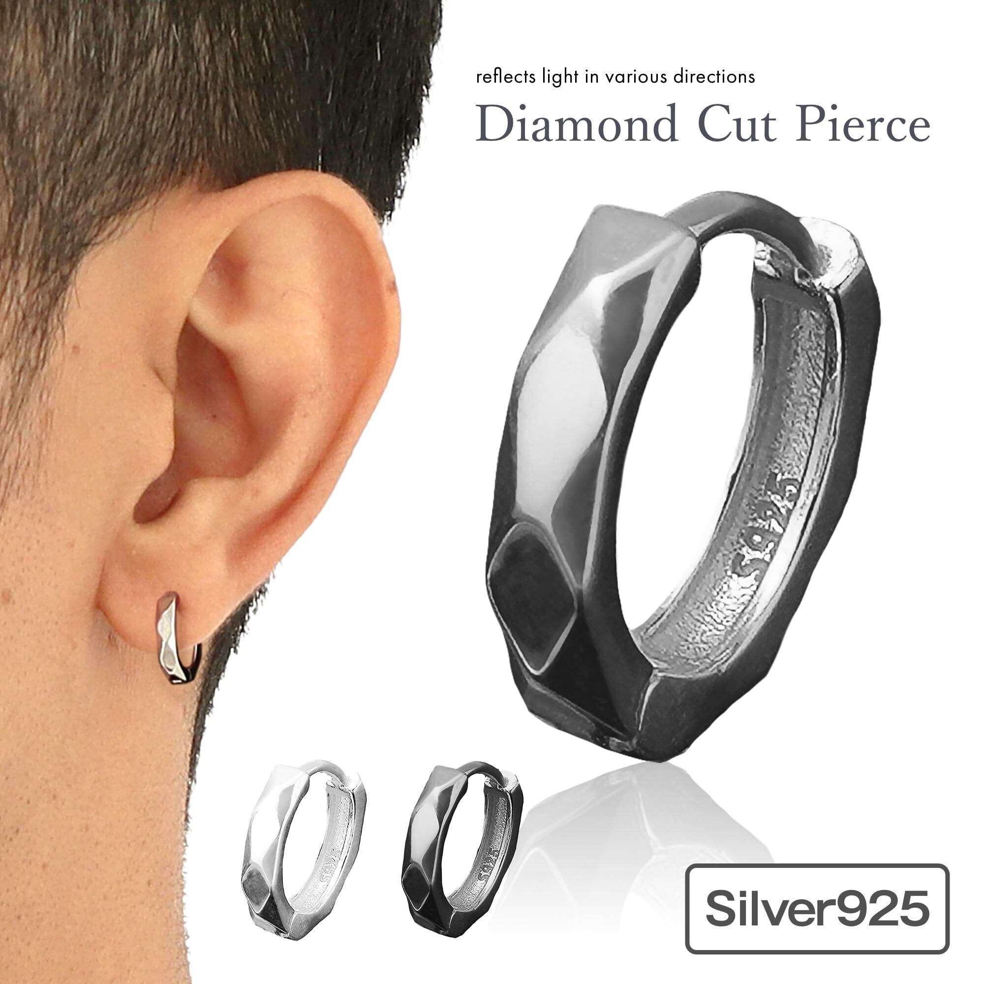 [Puente] ピアス メンズ シルバー925 プレゼントBOX付き カット入り フープピアス フープ リング リングピアス ダイヤカット カット シンプル 小ぶり 片耳用 シルバー ブラック 黒 黒色 プレゼント ギフト 18g