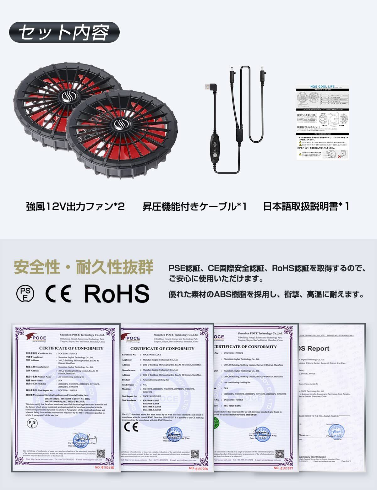 【昇圧可能&12V強風】昇圧機能付き、最高12Vまで電圧が上昇するため、冷却効果が大幅に向上します。最大風速9.8M/Sまた約5600RPMになる高速回転速度で衣服の中にパワフルな風量を実現して体を瞬間に冷やすことができます。このファンユニットは、40度以上の暑い屋外環境でも使用することが可能です。屋外作業を行う労働者が涼しくなり、熱中症予防に最適です。