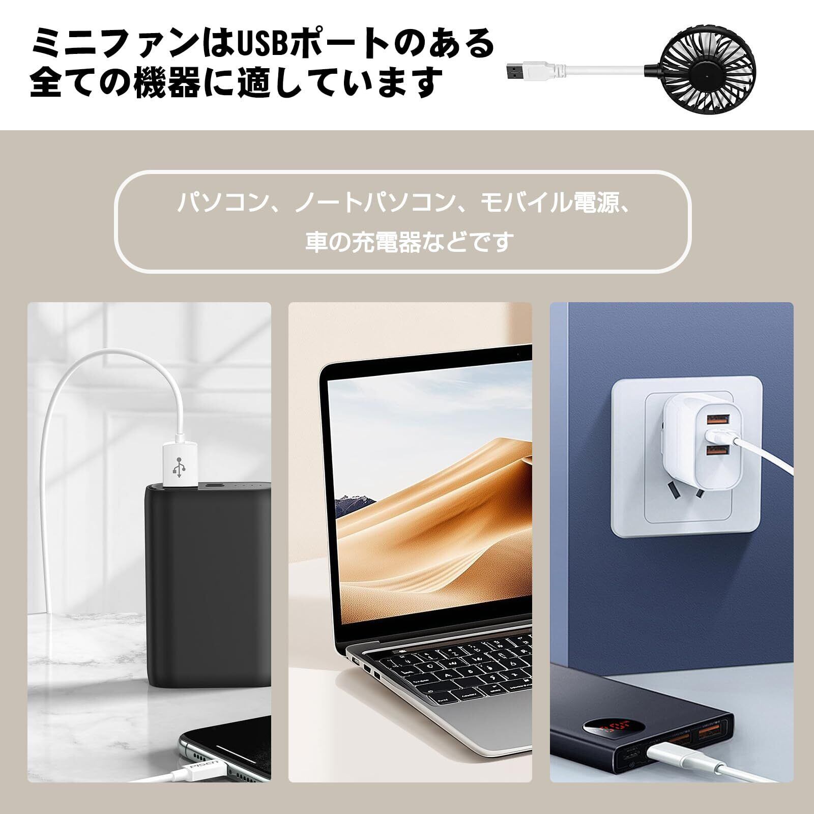 【USB給電式携帯扇風機】USB電源式なので、パソコン・ノートPC・モバイルバッテリー・USBアダプターなど、あらゆるUSBポートに接続するだけで手軽に使用可能です。オフィス・家庭・外出先・旅行中など、場所を選ばずに快適な風をお届けします。