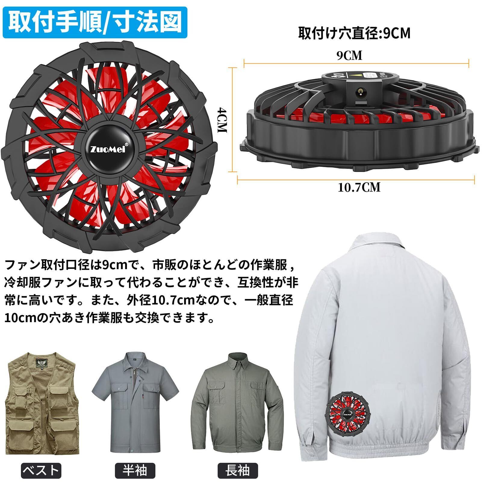 ZuoMei 12Vファン 作業服ファン 扇風機 USB電源5-12V変換ファン 12V互換ファンユニット ブラシレスモーター 6000RPMスピード超大風量 ファンブレード清潔可 85度の傾斜排気口 サーキュレーター QC3.0急速充電バッテリーに対応 12v高電圧出力スイッチが発熱しない2年付き
