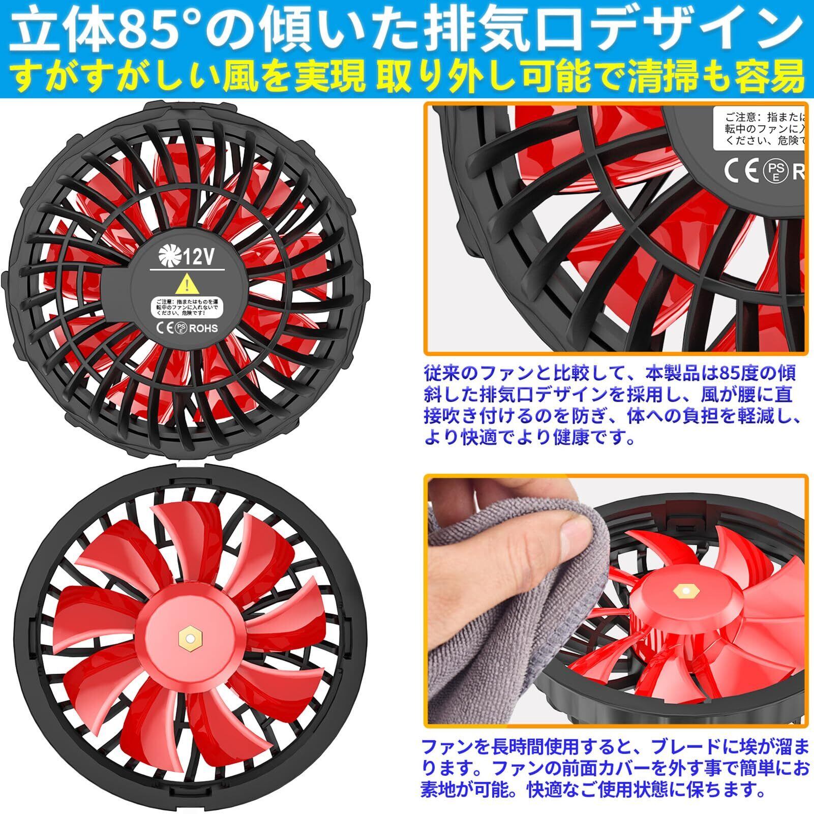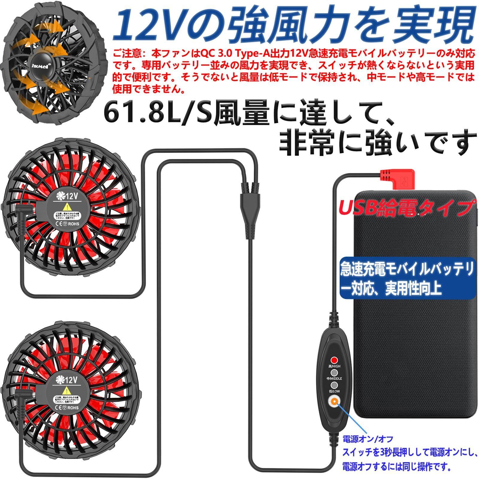 【モバイルバッテリー対応】:このファンセットはファン専用バッテリーを購入する必要がなく、既存の急速充電モバイルバッテリー(QC 3.0type A出力12Vに対応できるだけ)でファンを動かすことができ、しかも風量が非常に大きいです!専用バッテリーを使うファンと比べて、風量は全く同じです。12V高電圧出力でもスイッチが発熱しません!QC対応急速充電モバイルバッテリーは、冷却服ファンだけでなく、他の電子製品の充電にも使用でき、持ち運びに負担がかからず、非常に実用的で便利です。