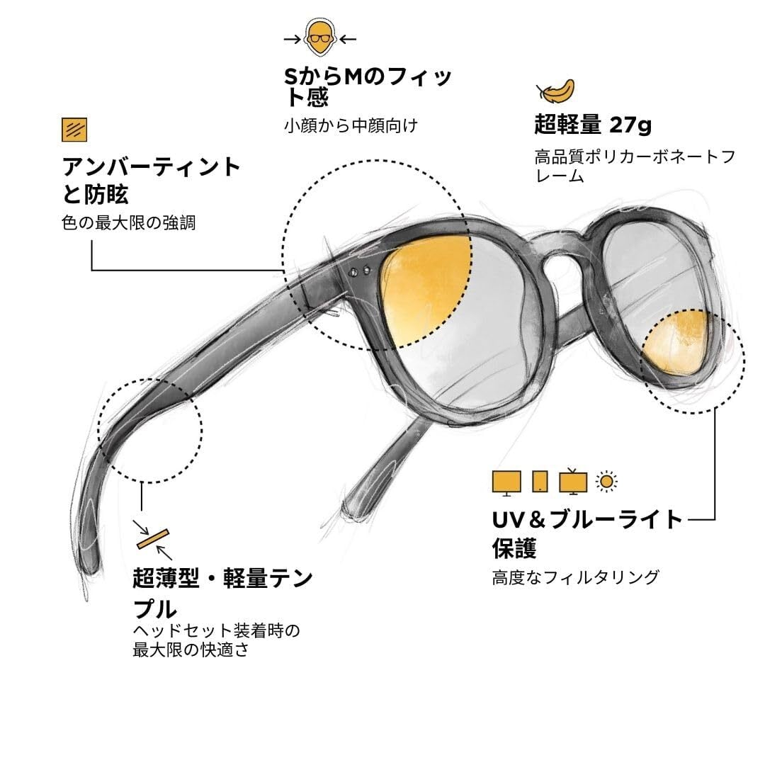 ️ 取得済み PLASMA 技術(アンバー):ゲーミンググラス。380nmから400nmのブルーライトを100%カット // スペクトル全体で86%カット [380nmから450nm]。100% UV保護を提供します。