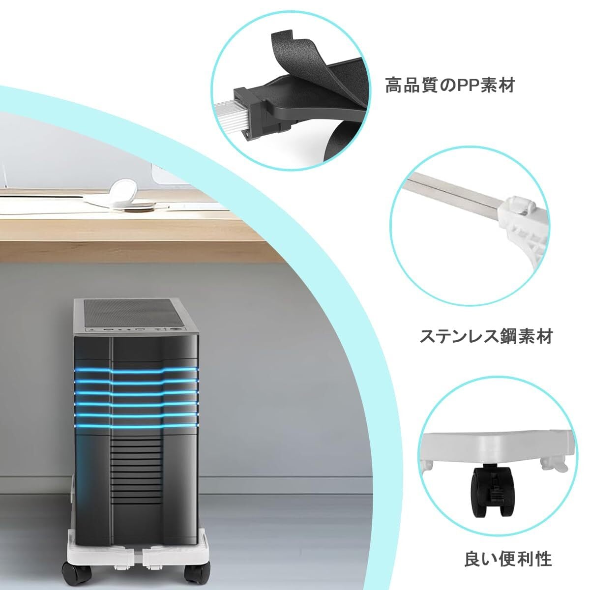 ⇝【セット内容】CPUスタンド×1台、キャスター付きx4個、サイズ:横幅約42cm~55cm、縦幅約22cm~35cm;カラー:ブラック;耐荷重:約25kg。
