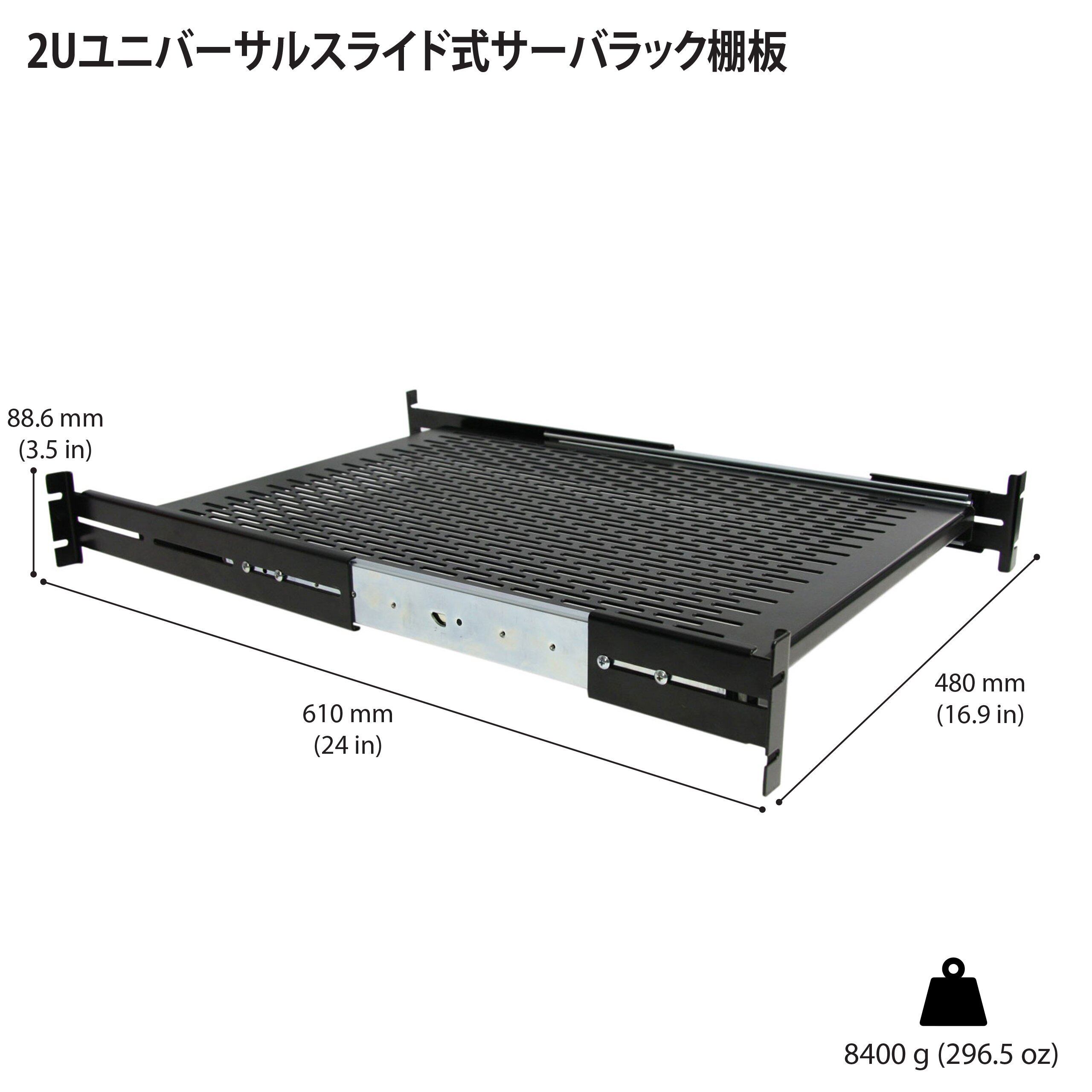 19インチラック対応、奥行き調整可能なスライド式サーバラック棚板。ラックマウントに対応していない機器をサーバキャビネットやオープン型サーバラックに取り付けることができます。この製品は、米国連邦政府貿易協定(TAA)が定める要件に準拠しており、政府の GSA スケジュールに対応しています。 このスライド式棚板は、放熱穴付き冷延スチール製で最大耐荷重は22.7kgとなっています。2本のロック付き調整可能レールが付いており、奥行き510mm~744mmでキャビネットやラックに取り付けることができます。棚板を3/4引き出した位置でスライド動作を止めるロック機能がついており、棚板の脱落を防ぎ、また、メンテナンス作業中に棚板がスライドして元に戻ってしまうことがありません。 StarTech.comでは全使用期間を提供しています。