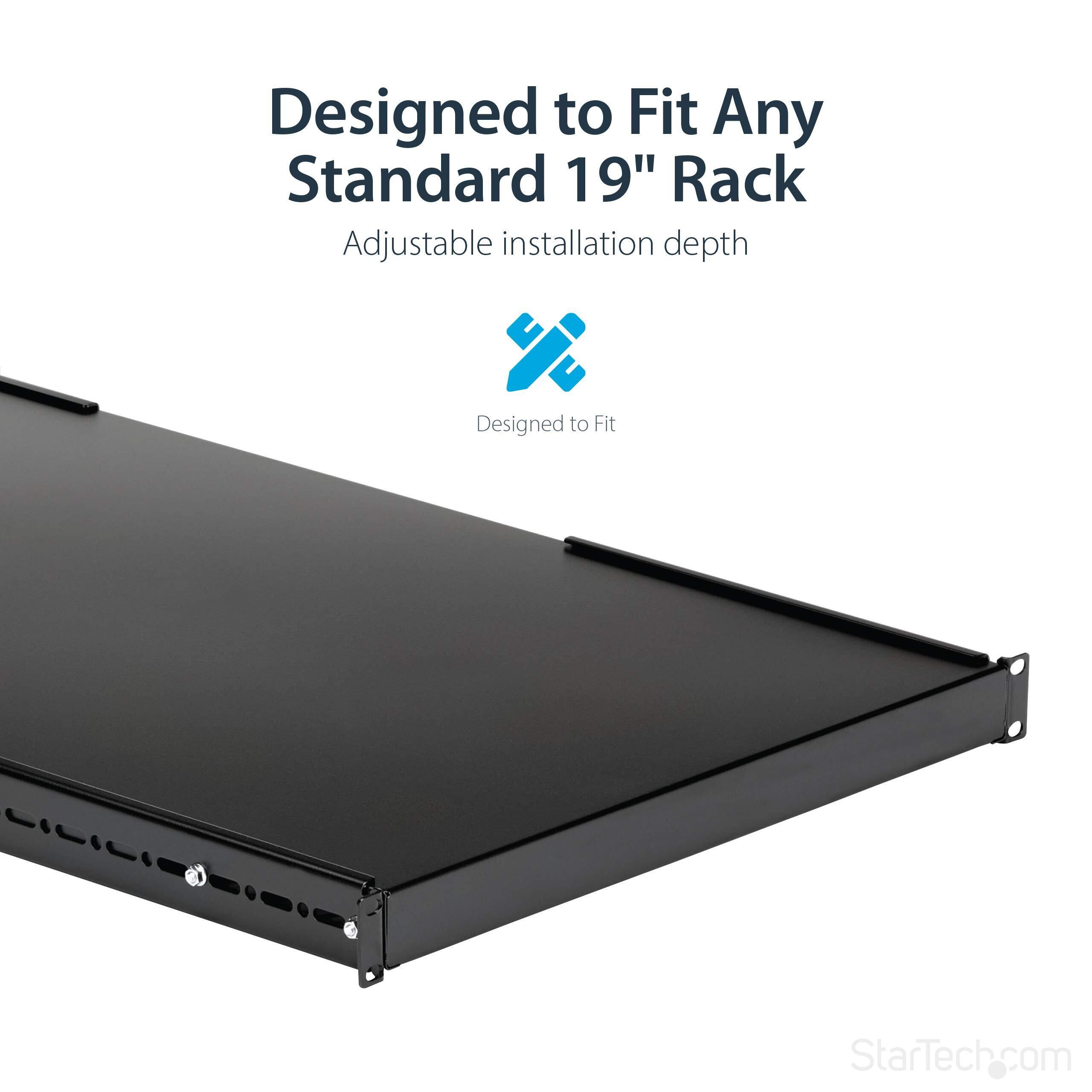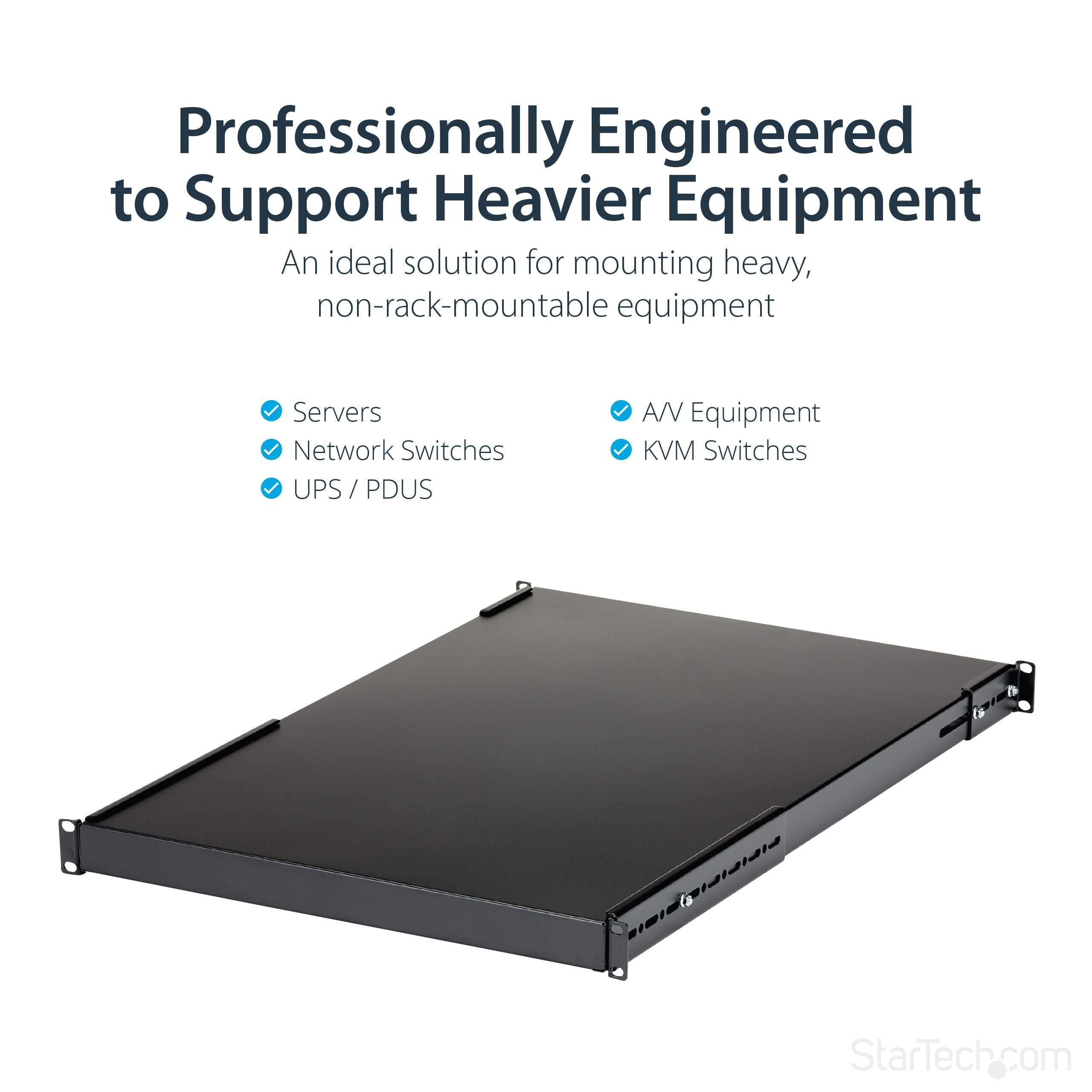 奥行き調節が可能な高荷重固定式ラックマウント用棚板(1U)。標準型19インチのサーバラック/キャビネットに対応します。この製品は、米国連邦政府貿易協定(TAA)が定める要件に準拠しており、政府の GSA スケジュールに対応しています。 使用するラックに合わせ、取り付け奥行きを495mmから974mmまで調節できる頑丈な棚板です。1.0mm厚 SPCC商用グレードの冷延スチール構造で、耐荷重は80kgとなっています。ラックマウント型ではない大型機器、重量のある工具、周辺機器をラックやキャビネットに格納する耐久性に優れたソリューションです。 StarTech.comでは全使用期間を提供しています。