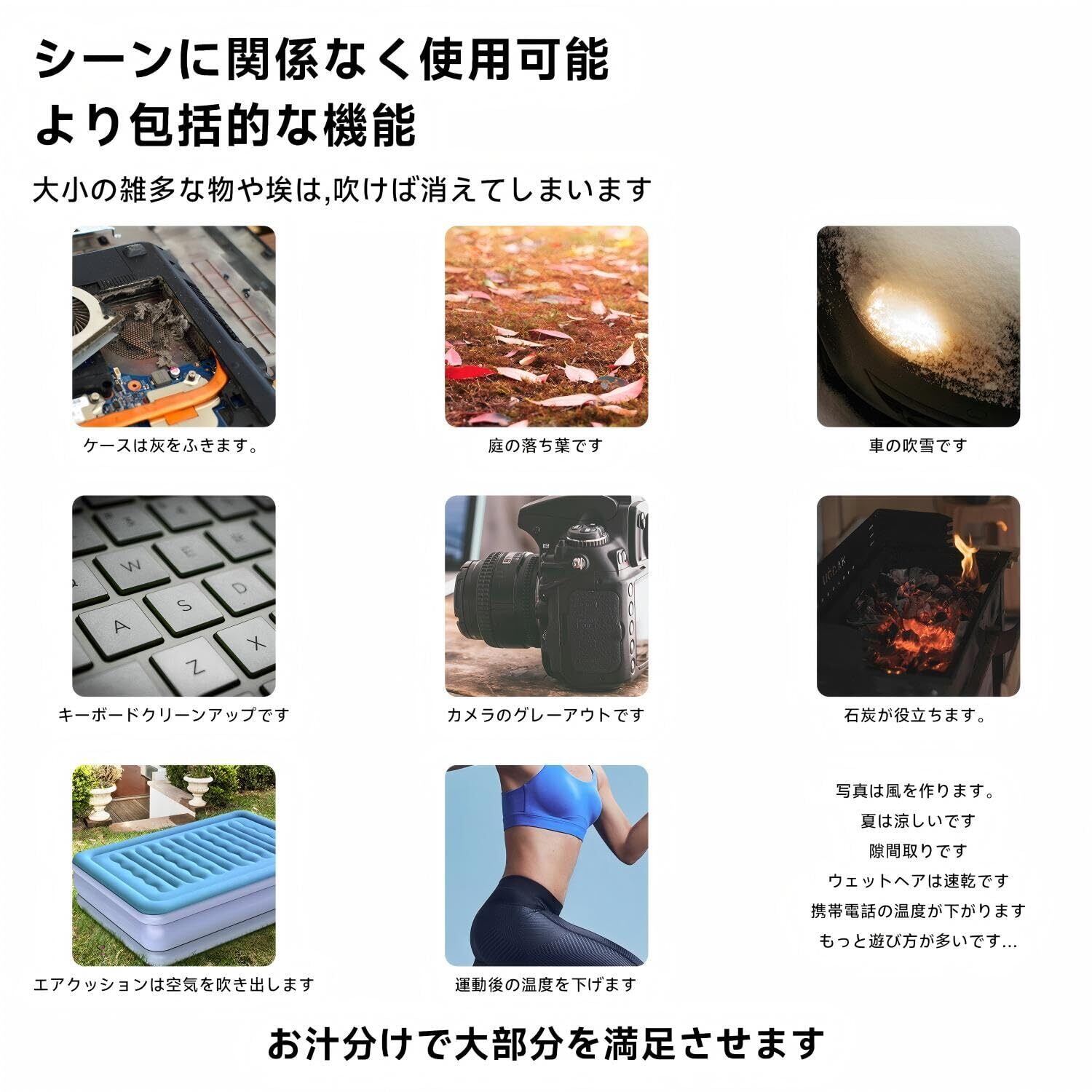 【ブラシレスモーター省エネ設計&エアダスタータンクアップグレード版】ブラシレスモーターを採用し、従来比騒音を低減しながら空気運動エネルギーを大幅に向上!耐久性が向上しただけでなく、消費電力も30%削減。内蔵の20000mAh大容量バッテリーで外部電源不要。充電時間2時間以内、最小風量時最大3時間連続使用可能。従来の使い捨てスプレー缶と異なり、ガス臭や空缶の心配なく安全に繰り返し使用可能。充電式設計でエアスプレー缶と比較し年間5000円以上節約。