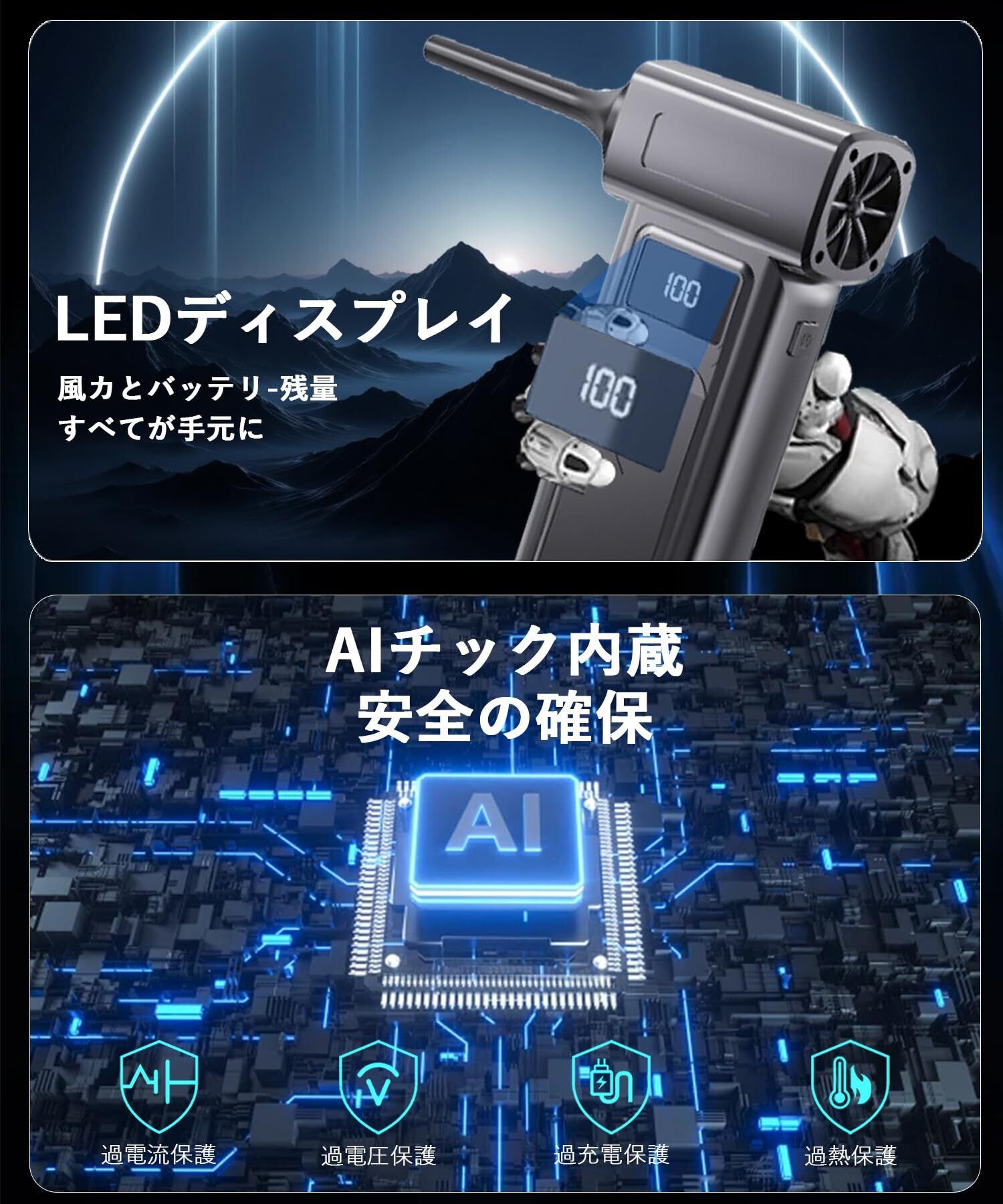 【8000mAh大容量バッテリー・安全安心】従来4000mAh容量電池と比べて、TVVTO電動エアダスターはバッテリー容量2倍以上!フル充電しなら、最大約120分で使用できます。インテリジェントで効率的なバッテリー過熱保護。製品には温度保護システムが搭載されており、一定の温度を超えると自動的に停止する仕組みになっています。これにより、過熱やその他の問題を防ぎますので、安心してご使用いただけます。※使用中の注意事項:使用前、ファンにホコリや他の異物が詰まっていないかを確認してください。