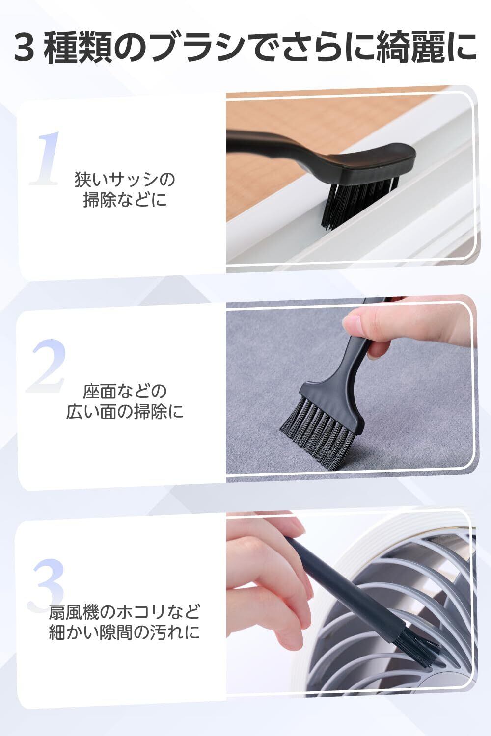 ■付属のブラシを使い分けることで、座面などの広い面の掃除から扇風機のホコリなど細い隙間の汚れまで、しっかり取り除けます。
