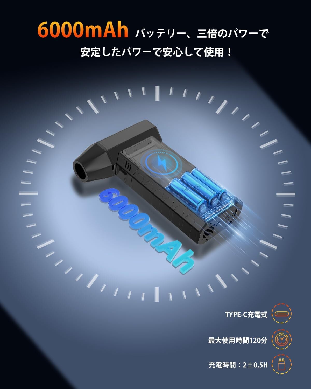 【6000mAh大容量+Type-C充電式】エアーダスターの弱点を克服!フル充電で最大90分連続使用可能な上、急速充電で2.5時間で満タンに。車内でのPC掃除中や洗車現場でも突然の電源切れなし。内蔵ターボジェットファンは過熱防止用ヒートシンク付きで、長時間連続使用でも安定出力を維持します。