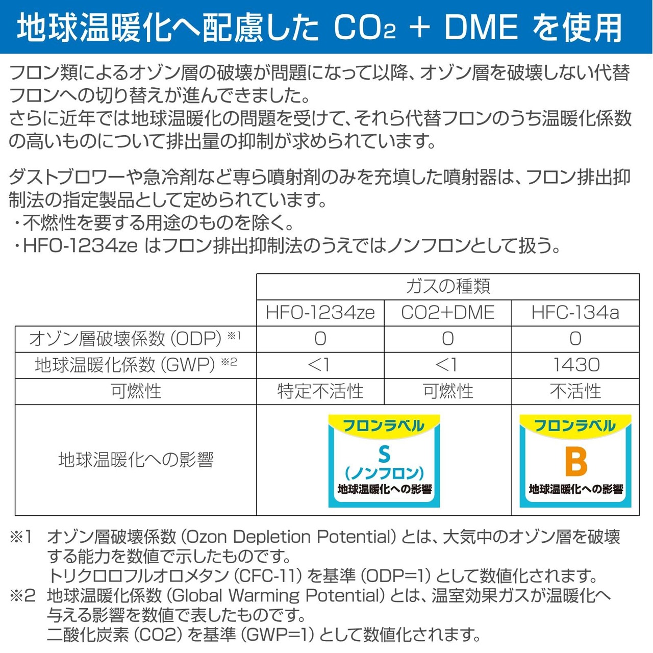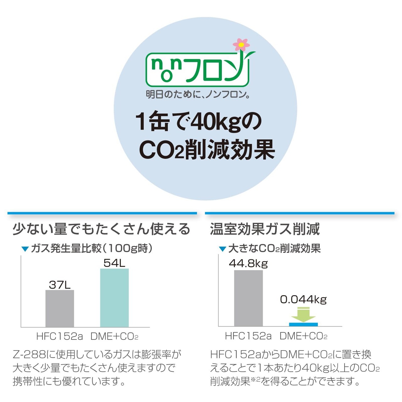 ※1 HFC152aの地球温暖化係数を140、DME+CO2(Z-288)の温暖化係数を0.2とし、それぞれ120Lのガスを発生させたときの計算。