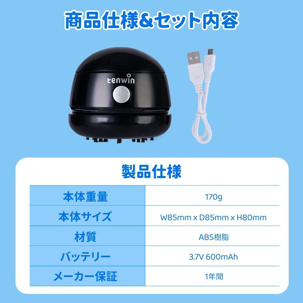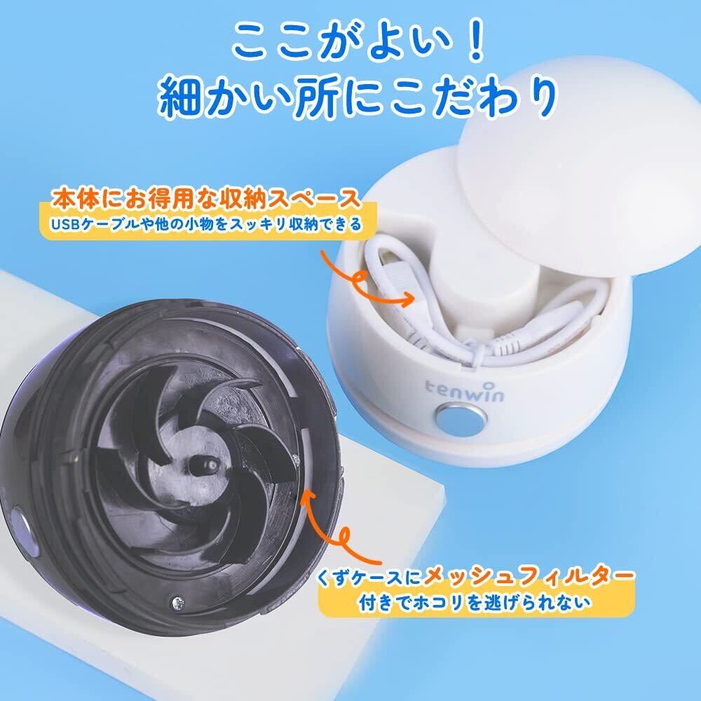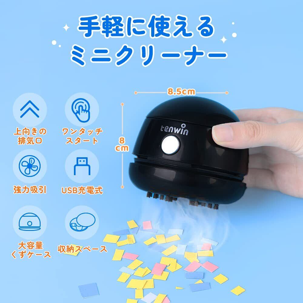 【強力吸引でコスパよい】強力で性能に優れている電機モーターを採用して、吸引力つよくて、底面の開口部からゴミを吸い取ることができます。上向きの排気口からの排気なので、下部のゴミを吹き飛ばす心配がいりません。子供部屋の勉強机やテーブルにある消しカス 、塵、えんぴつの削りかすを掃除だけではなく、底にブラシ付きで、キーボードの隙間のほこり、車掃除でも楽々掃除できるミニ掃除機です。