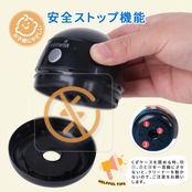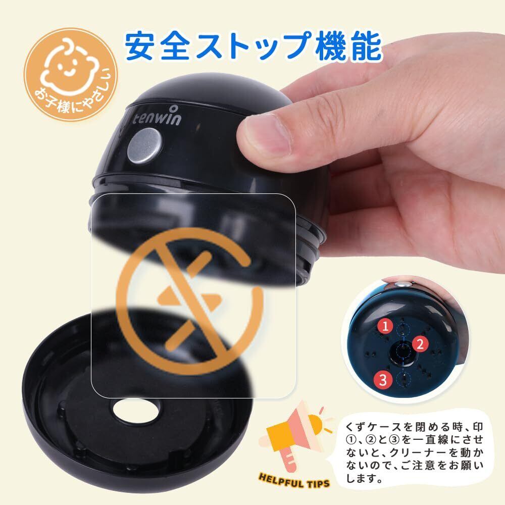 【お子様が毎日安全、快適に使える5つのデザイン】①外した状態では動かない「安全オートストッパー機能」、②お子様でも片手でもって指一つで起動させる「ワンタッチ起動デザイン」、③USBケーブルや他の小物を紛失されないようにしっかり保管できる「ミニ収納スペース付き」、④吸入口へ指が入ることを防ぐ「安全バー」、⑤下カバーを回してゴミを捨てられる楽々な「メンテナンス」などで、お子さまがご自分でも安全・快適に使えます。