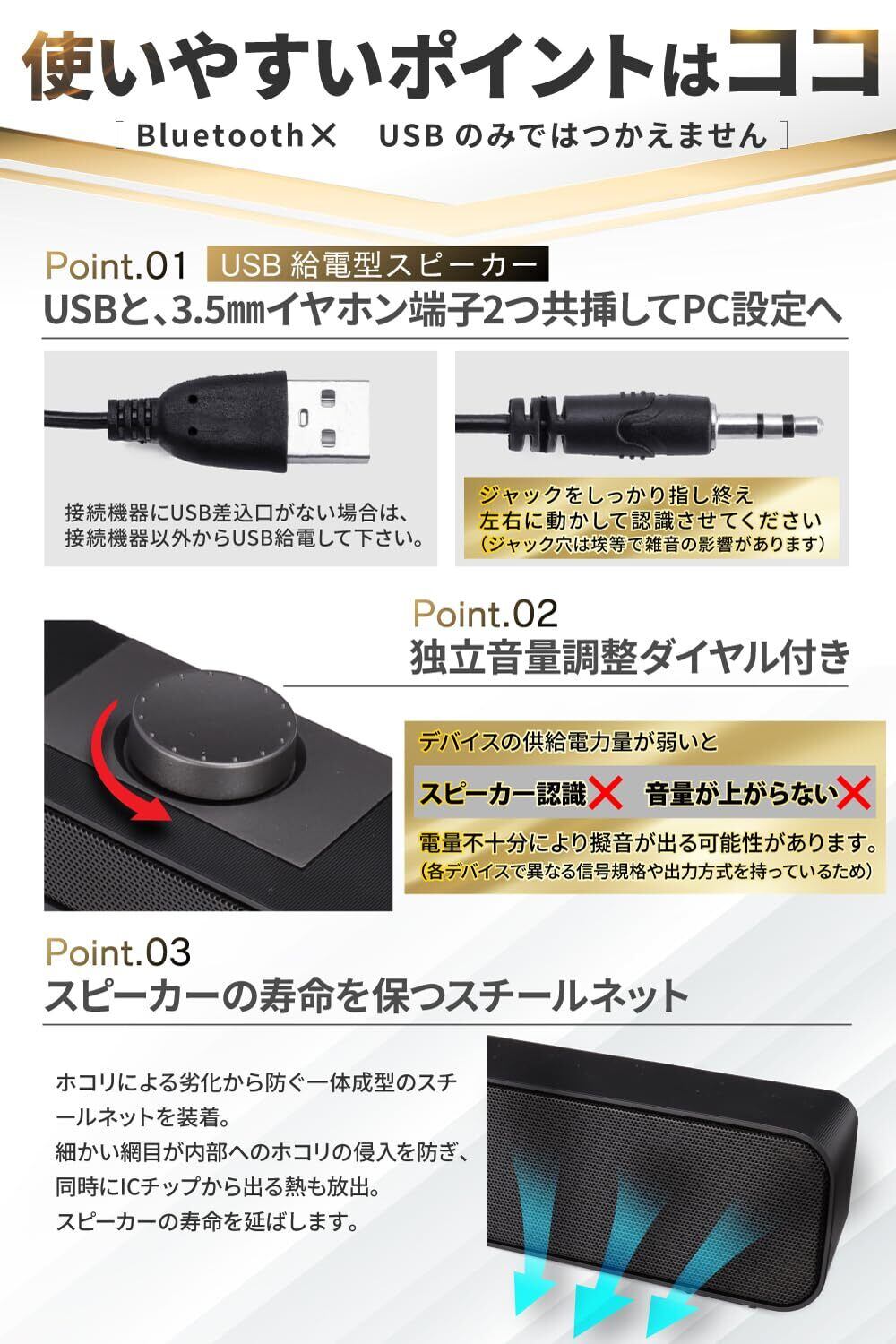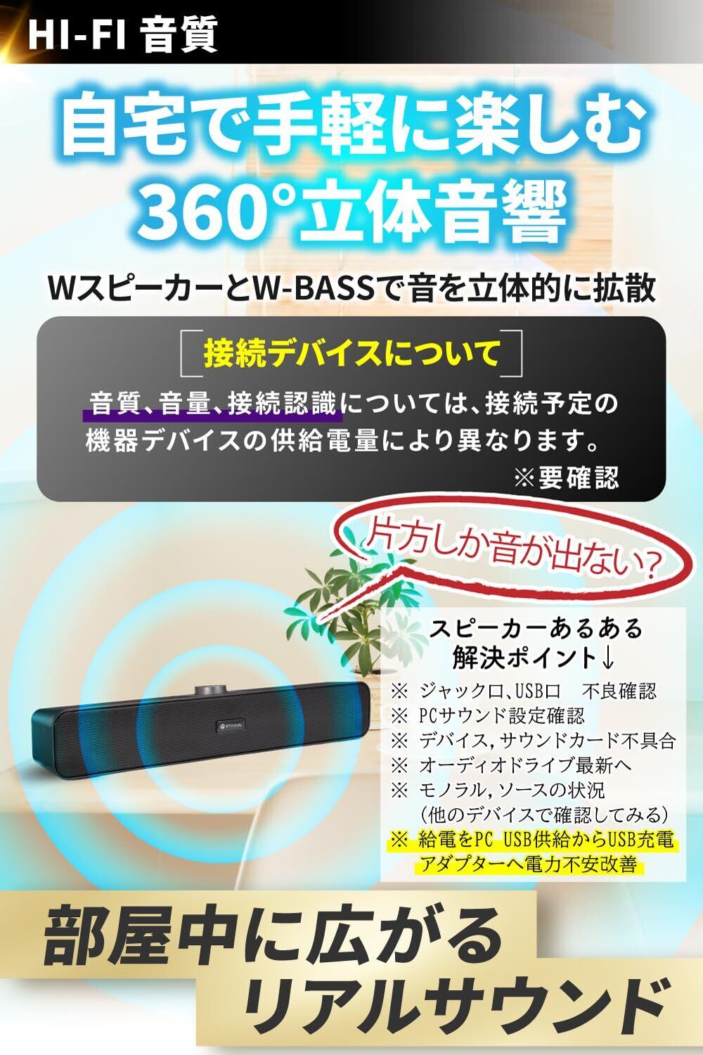 USB給電型スピーカー【注意】■受信認識の設定必要です➡PC設定➡サウンド➡出力デバイス➡【外部USBスピーカーを選択◎、内蔵スピーカー選択は✖】(ご使用方法)USB給電型スピーカーの為、パソコン、ラップトップやモバイル電源などのUSBポートに接続して電源を供給出来ます。スピーカーから音を出すためには、音源出力はヘッドフォン(イヤホン)3.5mmステレオミニジャックのあるデバイスの音声端子とUSBの両方につなぐと音楽を楽しめます。ボリュームは、手軽に音量を調節できます(ノイズ割れ、本体振動を防ぐためにボリュームMAXは適しておりません)又、音が出にくい症状などご座いましたら、USBやジャックの差込口の入れ直し、使用機器の再起動など行ってください。しっかり奥まで入っていないと正常に認識されず、雑音、不認識の原因になりますのでご注意ください。使用機器によっては、適合しにくい又は認識しないものもあります。※※※使用機器(デバイス)によって本来の製品の能力を十分に出せないこともあります(供給電量が弱い、小さいなど)適合についてなんでも対応しますので問い合わせください!
