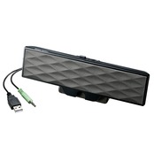 ●ノートパソコンやタブレットの画面上部に固定でき、USBケーブルで電源供給できるUSB電源方式のサウンドバースピーカーです。●様々な厚みのノートパソコンに装着できるクリップ付き、最大25mm幅まで装着可能です。●電源をUSBポートから供給するUSB給電方式のスピーカーです。AC電源を必要としないので接続が綺麗にでき、簡単に設置できます。●製品単体でも自立するため、ノートパソコンの横やデスクトップパソコンでのディスプレイ下などレイアウトは自由にできます。●音源出力は3.5mmステレオミニジャック接続でパソコンの音声端子につなぐだけで音楽を楽しめます。●ボリュームコントロールとパワーON・OFFスイッチが分かれているので、スイッチを入れればいつもの音量ですぐに音楽を楽しめます。●実用最大出力6W(3W+3W)でコンパクトなサイズながら迫力のある高音質を再生します。■カラー:ブラック■実用最大出力:6W(3W+3W)■周波数特性:80~18000Hz■スピーカー形式:密閉型フルレンジスピーカーシステム■スピーカーサイズ:40mm×40mm■インピーダンス:4Ω ■入力端子:ステレオミニプラグ(3.5mm)■電源:USBポートより供給(DC5V 500mA)■サイズ:W205×D35×H68mm(スピーカー本体)■重量:約290g(スピーカー本体のみ) ■ケーブル長:PC接続ケーブル/約1.2mUSB電源ケーブル/約1.2m■筐体材質:ABS樹脂■付属品:取扱説明書・書