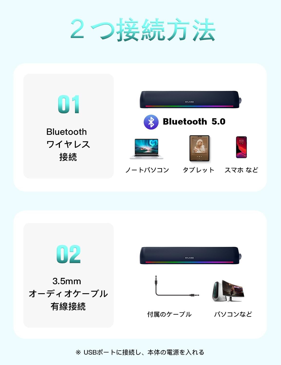【2つの接続方法】 Nylavee PCスピーカーには、Bluetoothと3.5mmオーディオケーブルの2つ接続方法があります。ノートパソコン、デスクトップ、PC、携帯電話、タブレット、PS4など幅広いデバイスと互換性があります。