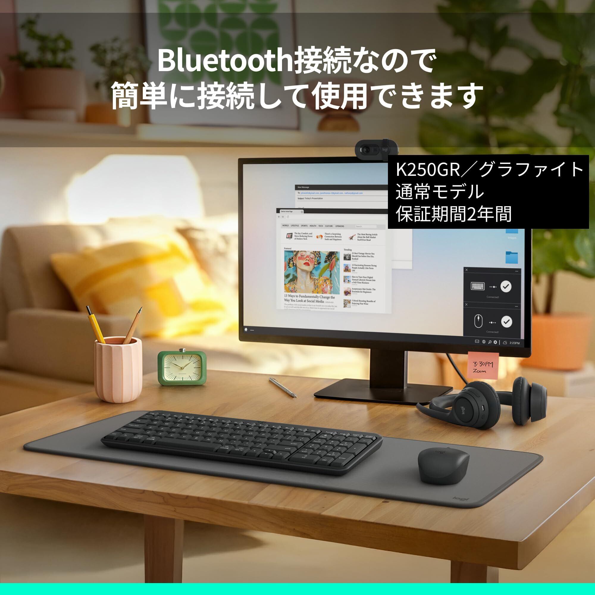 ロジクール K250 キーボードは、Bluetooth接続が可能なテンキー搭載のコンパクトなキーボードです。Bluetooth接続なのでUSBレシーバーが不要のため、USBポートを空けることができ、その分他のデバイスをUSBポートに接続ができます。また、毎日の継続的な使用にも耐えるように設計され、耐水設計*と合わせて安心して使用できます。