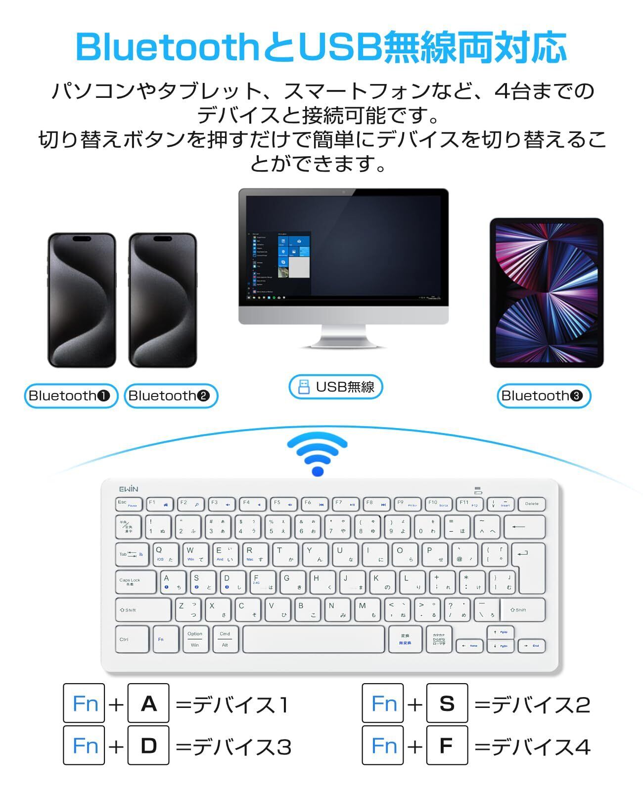 EWiN キーボード ワイヤレス bluetoothとusb無線両対応 JIS日本語配列 小型 mac android ios Windows多OS対応 ipad iphone タブレット パソコン スマホ 4台デバイス自由に切替え keyboard ブルートゥース パンタグラフ テンキーレス 薄型 軽量 スタンド付き 2.4GHz レシーバー付属 Type-C変換アダプタ付き ホワイト