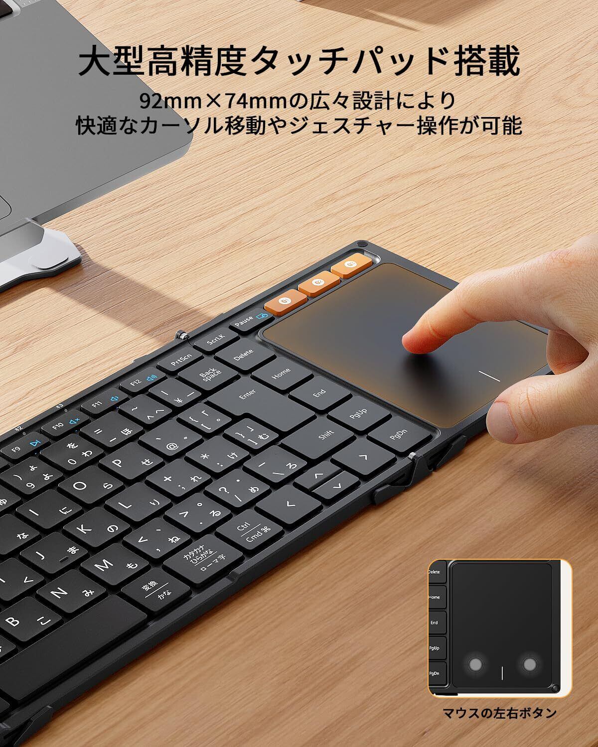 【大型の高精度タッチパッドを搭載】ipad キーボードの右側には、9.2cm x 7.4cmの大型かつ高精度タッチパッドを搭載しており、指先で画面スクロールやジェスチャー操作がスムーズに行えます。また、左右のクリックボタンも付いているため、マウスなしでもカーソルを快適に操作できます。(※注意: 1. iPadをご利用の場合は、ご使用前に「AssistiveTouch」をオンにしてください。2. タッチパッドは(iPhoneなどの)OSやアプリによっては一部のジェスチャー機能が利用できない場合があります。3. スクロール方向は、(Mac/iPad/Windows10/11など)一部のデバイス側で設定可能です。4.折り畳み部にロック機能がないため、平らな場所での使用を推奨します。5.タッチパッド(カーソル)の感度が悪い場合は、お使いのデバイスのタッチパッドの設定画面でタッチパッド(カーソル)の感度を調整できます。)