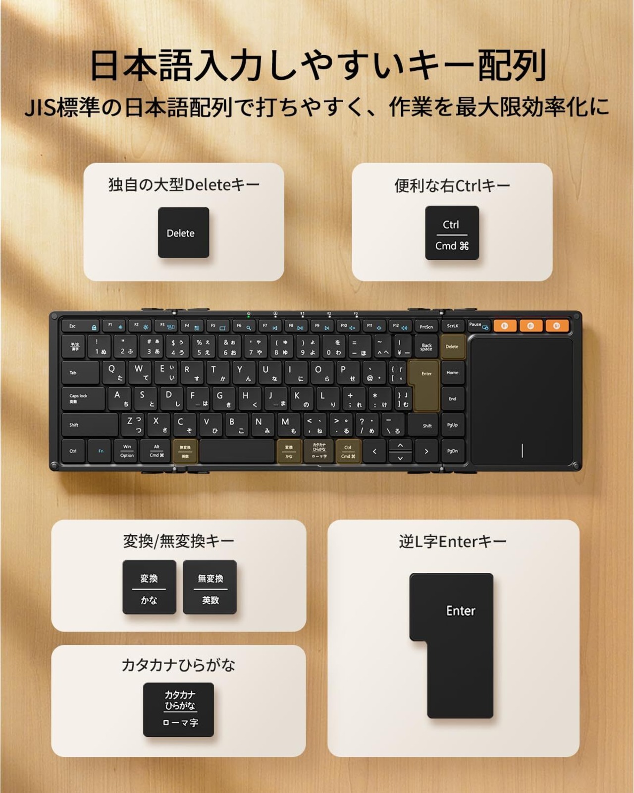 【打ちやすい日本語配列&13種類の便利なファンクションキー】JIS規格に準拠した標準日本語配列を採用したBluetooth キーボードには、逆L字の縦長Enterキーや半角/全角キー、変換/無変換キー、右Ctrlキー、独自の大型Deleteキーなどの日本語入力に特化したキーが配置されているため、打ちやすく、日頃お使いのキーボードから違和感なく移行できます。また、アプリ切り替え、ホーム画面表示、音量調整など13種類の実用的なファンクションキーを備えているため、利便性が高く、様々な操作がワンタッチで行えます。作業効率が大幅にアップ!