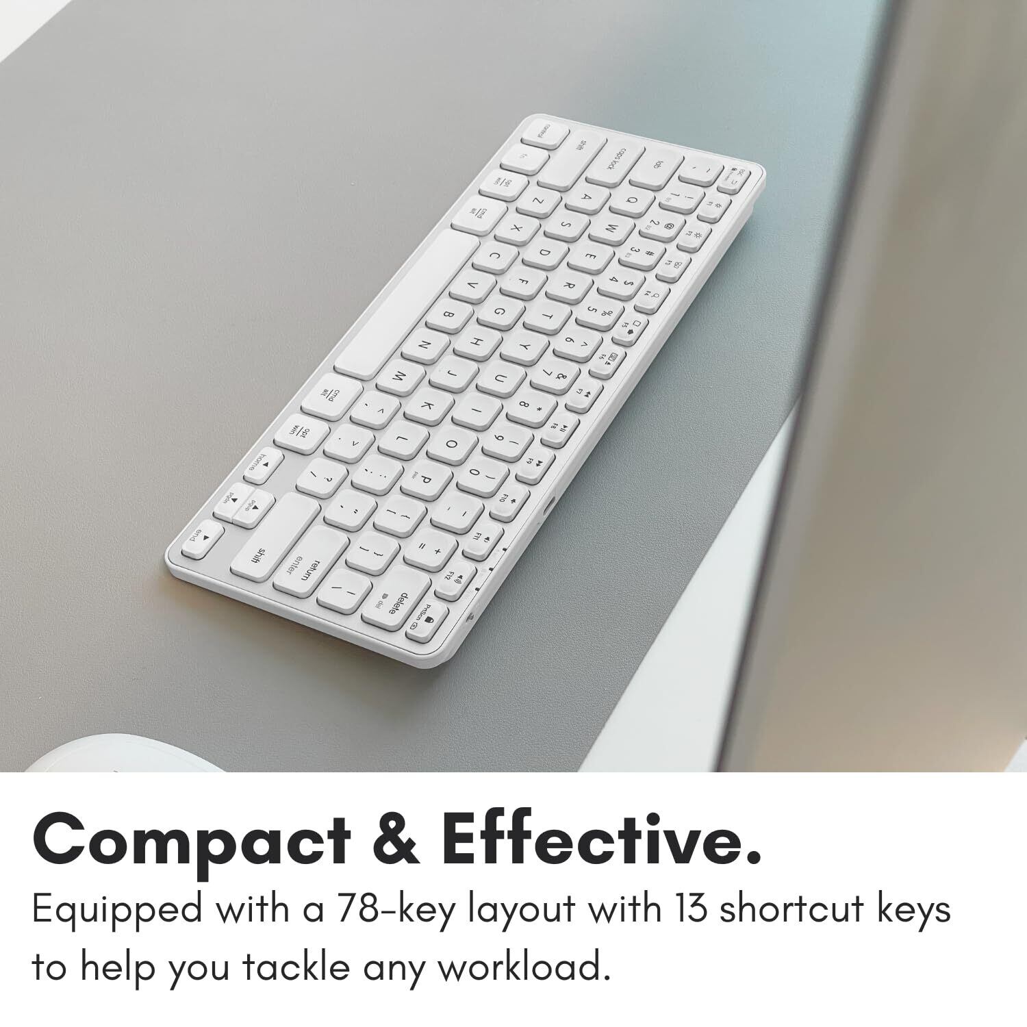 【快適で人間工学に基づいたタイピング】78キーのレイアウトと13個のショートカットキーを搭載したコンパクトなワイヤレスキーボードは、 高速シザー式フレクサーの反応性と静音性をきっと気に入っていただけます。 薄型キーキャップをしっかり支えるこのキーボードは、Apple製品にもWindows PCにも対応しています。 スペースを節約しながらあらゆる作業をこなすことができます。さらに、組み込み式のキックスタンドも搭載しています。