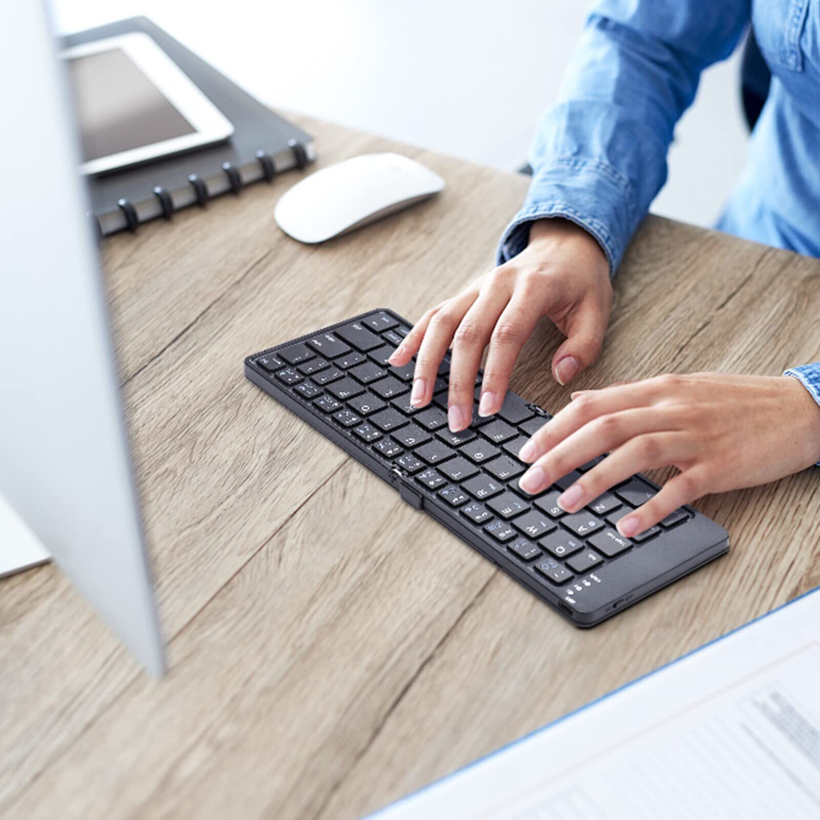 【コンパクトなのに入力しやすい!】もちろん英数配列キーボードで、ローマ字入力で日本語を入力できます。折りたたみ部分のキーの大きさが違うということもなく、思った以上に使いやすいキーボードです。ご満足できなければ返品を受付ます。ぜひ、お気軽にお試しください!