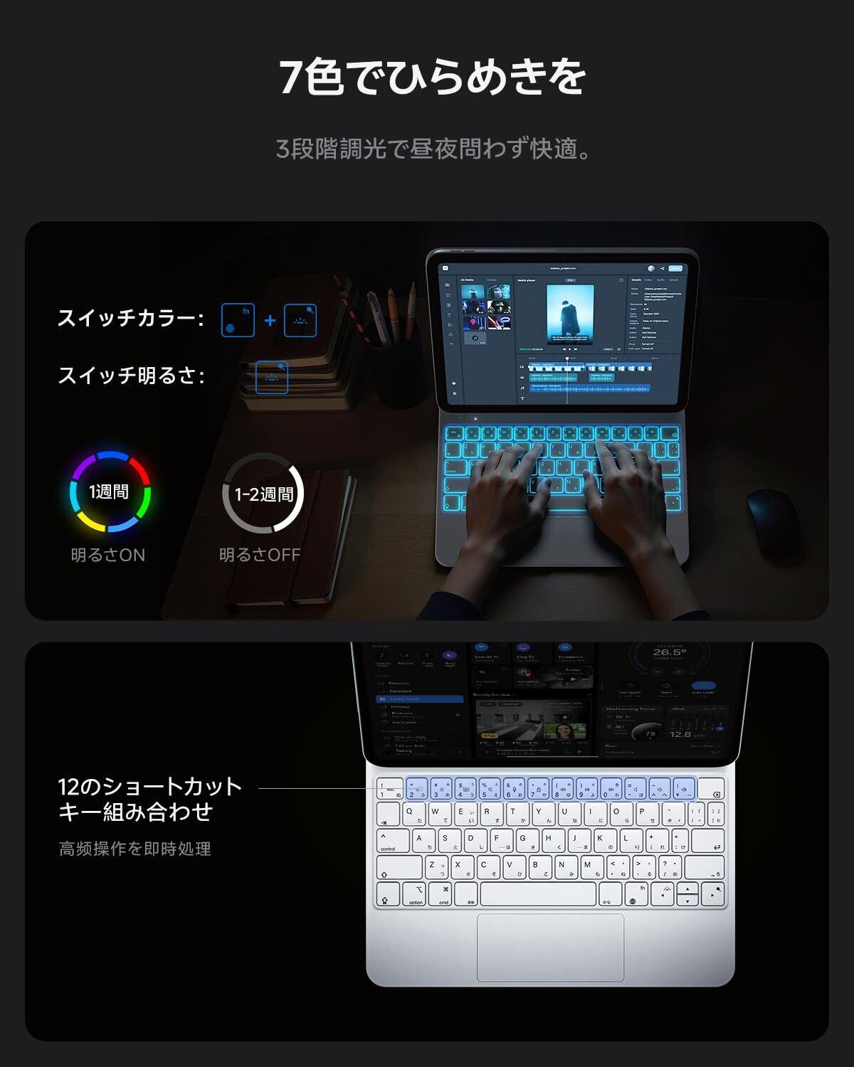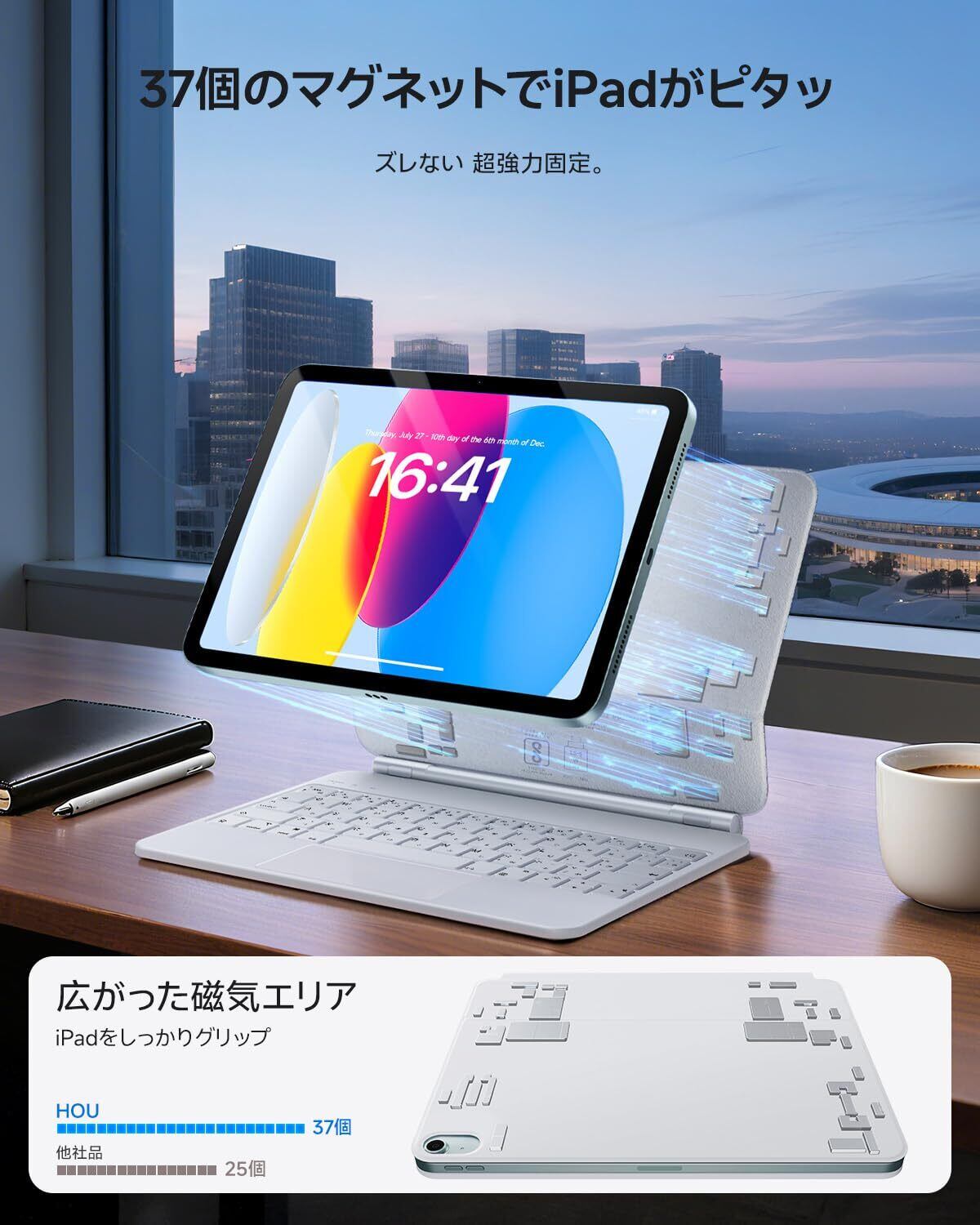 HOUためにiPad 11 インチA16 2025/10世代 ケース キーボード、IPad 10世代用マジックマグネティックスタンドキーボード、マルチタッチトラックパッド、フローティングデザイン、7色のバックライト、日本語配列、Bluetooth