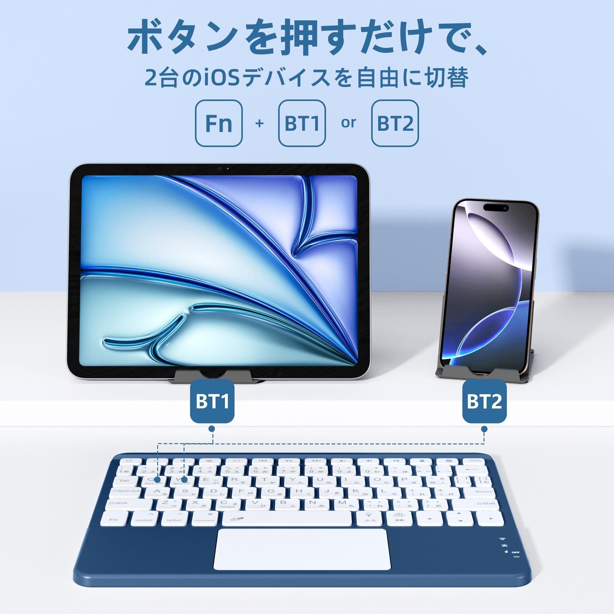 HETHOT ipad用 キーボード- 7色バックライト Bluetooth JIS日本語配列 スタンド付き タッチパッド搭載 2台のiOSデバイス切り替え可能 タブレット キーボード iPad/iPhone対応 無線 静音 Type-C充電式 薄型 軽量 日本語説明書付き 技通マークを取得済み ネイビー