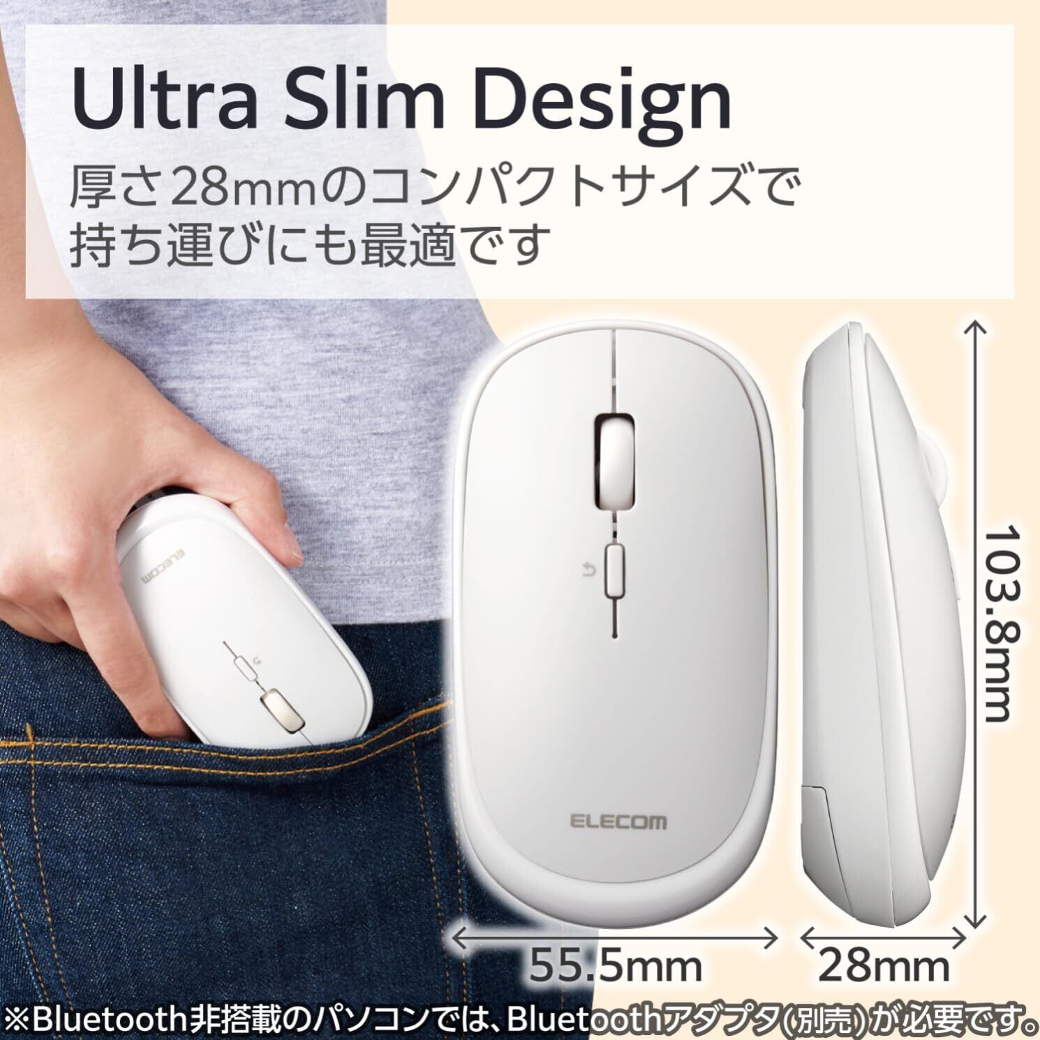 ■カバンに入れて持ち運びしやすい厚み28mmの薄型マウスです。