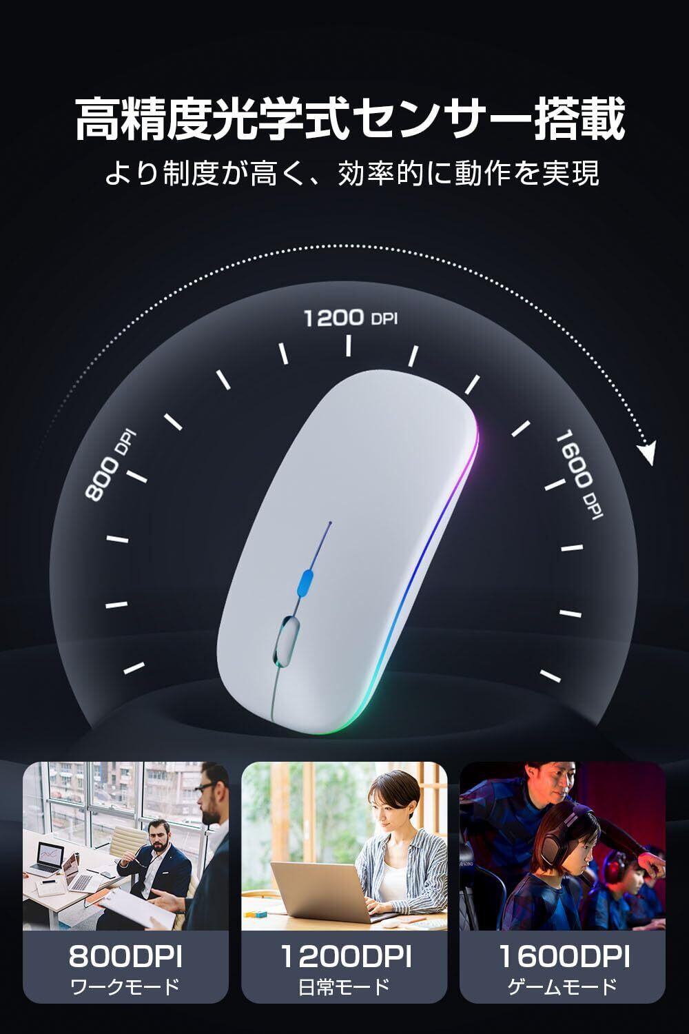 【2025極薄型モデル&Type-C充電式】マウス 無線 Bluetooth5.2 ワイヤレスマウス 静音 瞬時接続 小型 高感度 ブルートゥース 2.4GHz 3段階DPI切替 ゲーミングマウス 省エネ 7色ライト 光学式 高耐久性 Mac/Windows/Surface/PC/Macbookに対応 TELEC認証取得済み (white)