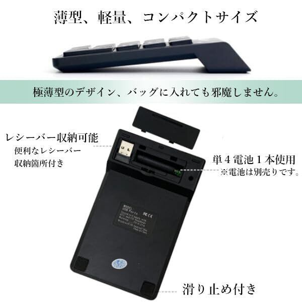 【商品説明】 ワイヤレス接続なので配線不要でデスク周りがすっきりして、作業に集中できます。 小型のレシーバーをUSBポートに差し込むだけですぐに使用できます。 難しい設定等は必要ありません。 超軽量で持ち転び便利。極薄型のデザイン、バッグに入れても邪魔しません。どこでも持って行けます。 しっかり安定し、激しいタイプをしても邪魔にならない超薄型で、快適に静かで操作できます。 【商品仕様】 サイズ 約14cm×約8.7cm×約2cm 本体重量 約85g ※電池の重量を除く 接続範囲 最大10m 接続方式 専用レシーバー(USB2.0対応 2.4GHz) 使用電池 単4電池1本 対応OS iOS/Windows7/8/10/XP/Vista ※本商品は、電波法令で定められている技術基準に適合していることを 証明する技適マークが貼付されていない無線機器です。 日本国内で使用する場合は、電波法違反になる恐れがございますので、 ご使用の際には、十分ご注意くださいますようお願い致します。