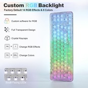 プログラム可能なRGBを備えたクリアキーボード:透明度の高い PC 素材で作られたケーシングとシャインスルーキーキャップは、純度と透明度を維持します。 二重層の透明なキーキャップは、クリスタルの美しさを保つだけでなく、キーキャップの文字の退色を防ぎます。南向きの LED を備えた PC ゲーミング キーボードには、工場出荷時に 15 個のライトと音楽リズムモードが設定されています。プログラム可能なソフトウェアを使用して、RGB カスタマイズとキーの再マッピングを行うことができます(注意:カスタムソフトウェアはWindowsのみ使用でき、Macでは使用できません。)。