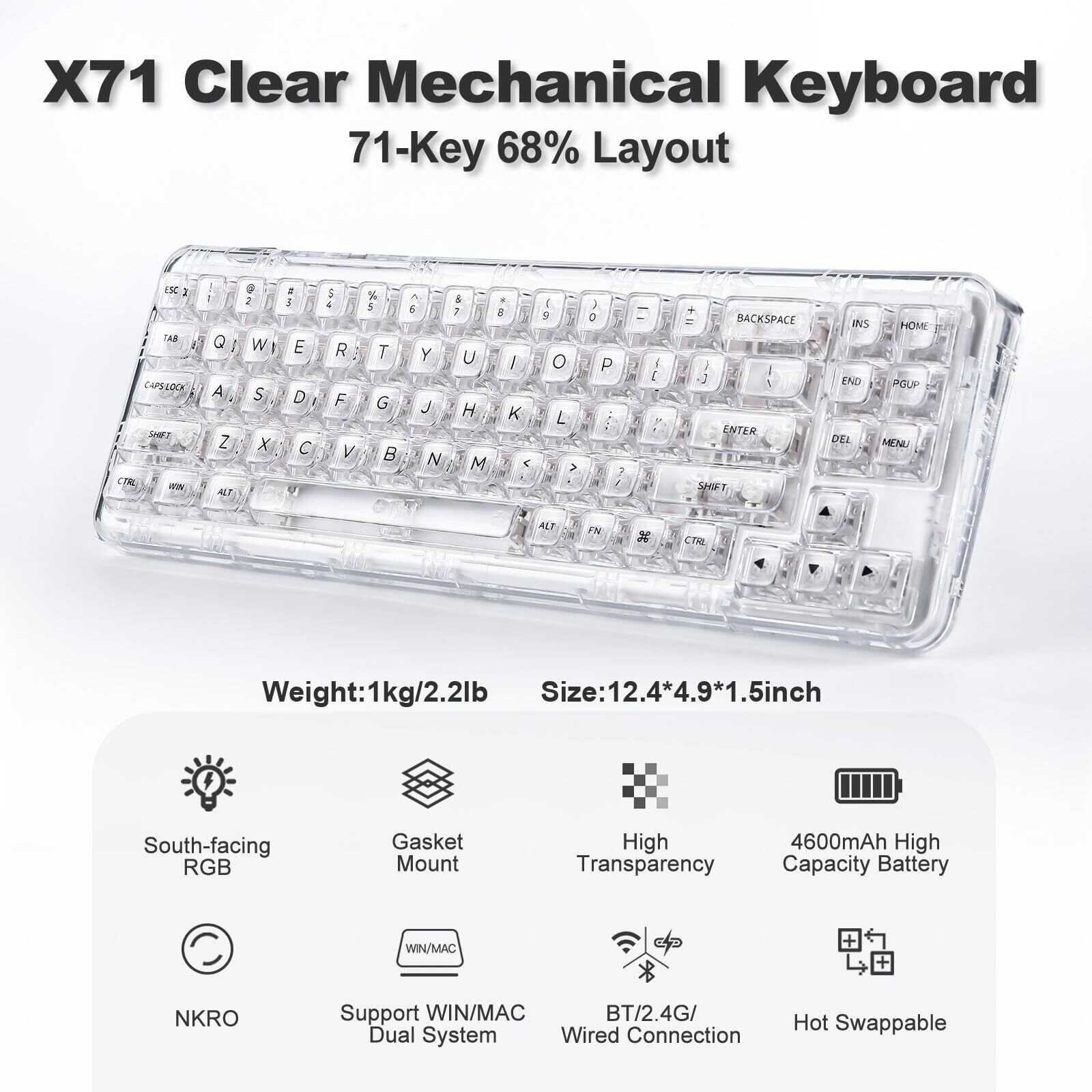 【在庫処分】YUNZII X71 メカニカルゲーミングキーボード 透明キーキャップ 71キー 68%配列 ワイヤレス ホットスワップ対応 BT5.0/2.4G/USB-C ガスケット搭載 RGB 無線 Windows/Mac用 技適認証取得(クリスタルアイス軸、ホワイト)