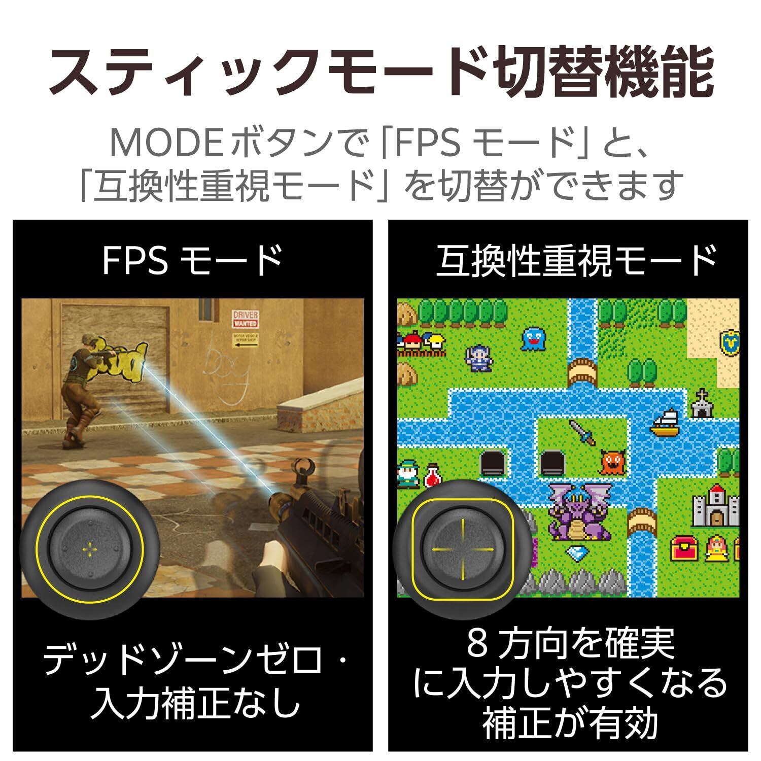 ■MODEボタンでデッドゾーンゼロ・入力補正なしの「FPSモード」と、8方向を確実に入力しやすくなる補正が有効な「互換性重視モード」を切替ができます。