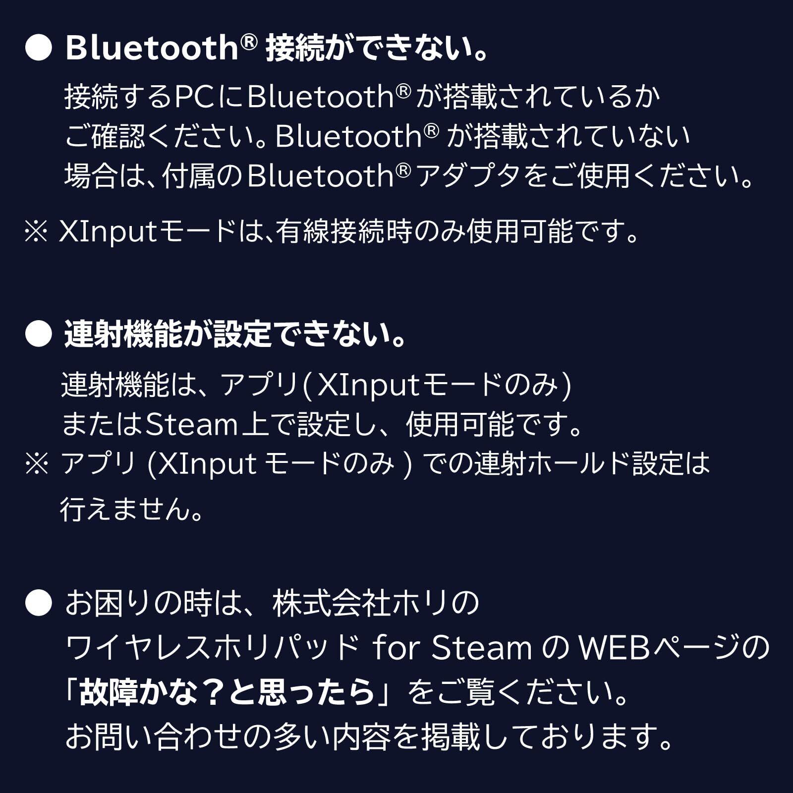 【ご注意】 ・ PCおよびSteam Deckのシステムソフトウェアによっては全ての機能がお使いいただけない場合があります。 その場合は、最新のシステムソフトウェアにバージョンアップしてからご利用ください。 ・ XInputは、有線接続時のみ使用可能です。 ※ 本品は以下の機能を搭載しておりません。 これらの機能を使用するゲームでは快適にプレイすることができません。 ・ 振動機能 ・ トラックパッド ・ヘッドフォンジャック 【内容品】 ・コントローラー × 1 ・USBケーブル(Type-A to Type-C) × 1 ・Bluetoothアダプタ(USB Type-A) × 1 ・取扱説明書 × 1 【ご注意・その他】 ※ 写真と本品は多少異なる場合があります。 ※ 本品の仕様および外観は改良のため予告なく変更することがありますのでご了承ください。 ※ 記載されている機能以外は搭載しておりません。 ※ 内容欄に記載されているもの以外は含まれておりません。 2024 Valve Corporation. Steam、Steam Deck及びSteamロゴは、米国及びまたはその他の国のValve Corporationの及びまたは登録です。 ● その他の全てのに関する権利は、それぞれの権利所有者に帰属します。 HORI CO., LTD