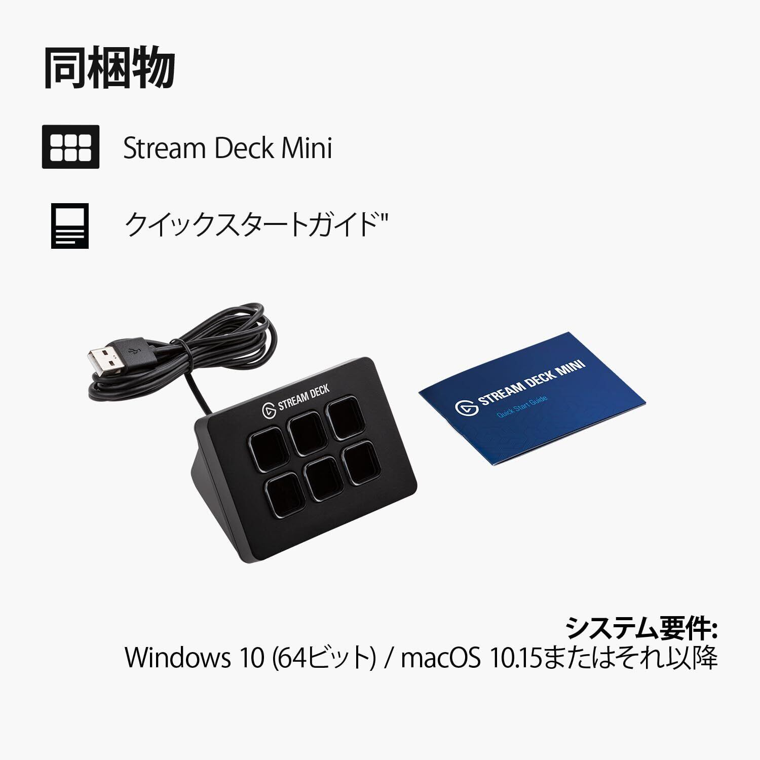 Stream Deck Miniは、カスタム可能な6個のLCDキーを使って、OBS Studio、XSplit、Streamlabs、Twitch、YouTubeなどの人気の高いアプリで即座に無制限のアクションをトリガできます — 使用できるアプリの数はどんどん増え続けていて、さらにStream Deck SDKが可能性をエンドレスにします。 技術仕様 サイズ:84 x 60 x 58 mm / 3.3 x 2.4 x 2.3 in. 重量:160 g キー:カスタム可能な6個のLCDキー インターフェイス: USB 2.0ケーブルを統合 (150 cm / 59.1 in.) システム要件 macos 10.15またはそれ以降、Windows 10 (64ビット)