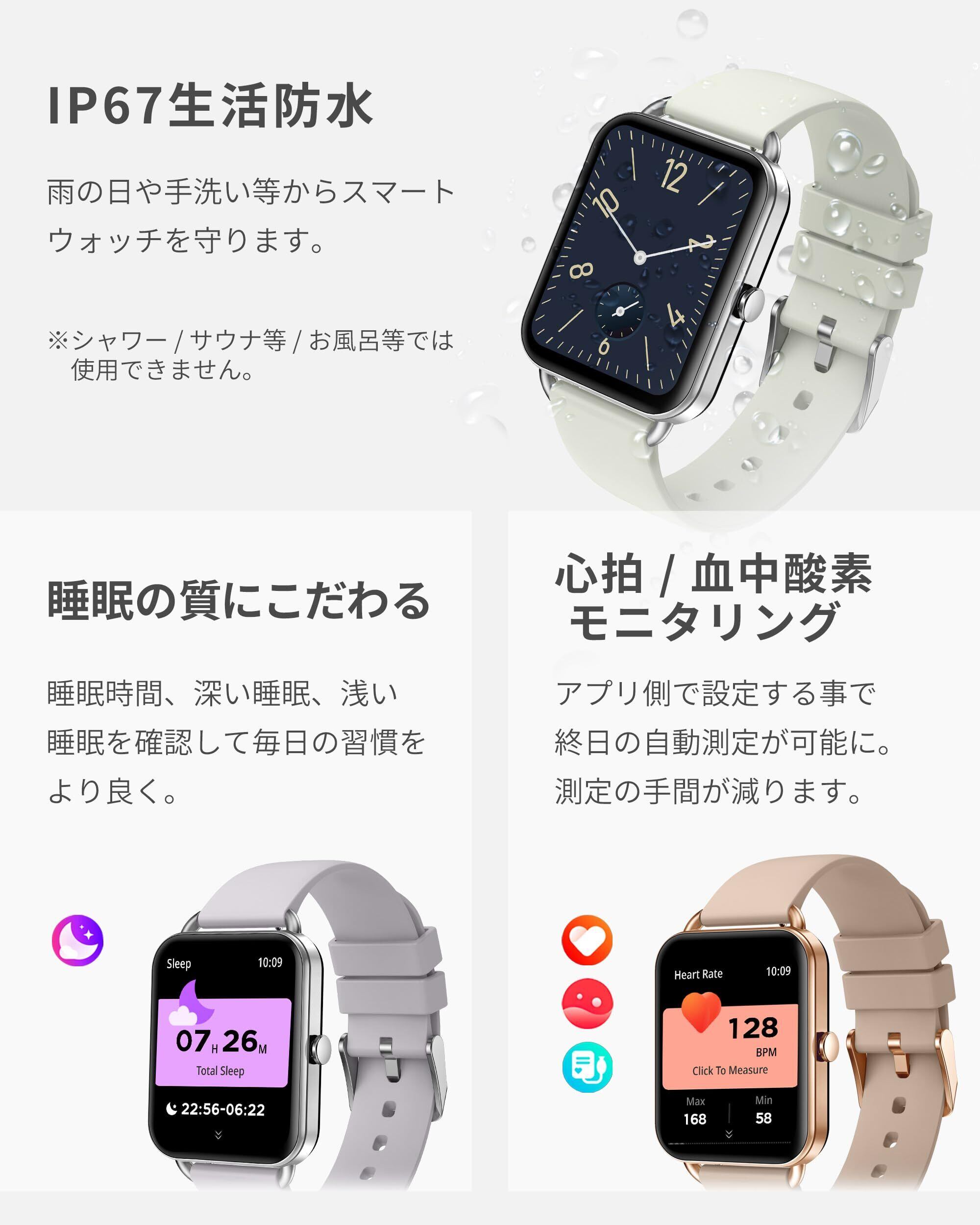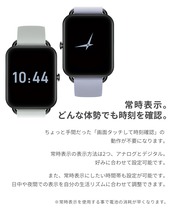 【備考欄】LINEの通話には対応しておりません。/ バイブレーションの強弱の感じ方は個人差がございます。振動は弱めに作られています。/ 本商品の歩数計は手首に巻く方式のトラッカーであり、歩いているであろう「動き」を拾って計測するため、デスクワークの状態によっては歩いていないのに歩いている(あるいは他の運動と判断する)事があります。/アラーム機能はミュート、振動のみでのご利用はできません。音が鳴るアラームタイプとなります。/ 商品開封後、スマートウォッチを利用頂く際に必ずアプリからBluetoothにてスマートフォンと接続をお願い致します。※同封の説明書記載の手順に沿って接続をお願い致します。※スマートウォッチの測定数値はあくまで参考値であり個⼈差があります。