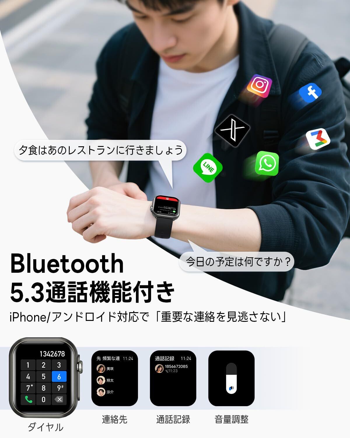 【最新Bluetooth5.3通話機能&メッセージ通知対応】本スマートウォッチは最先端のBluetooth5.3技術を採用し、接続の安定性と通話の音質が大幅に向上しました。スマートウォッチに連絡先を保存したり、発信・受信、過去10件の通話履歴確認、通話中の音量調整も可能です。内蔵のスピーカーとマイクにより、屋外でも快適に通話できます。さらに、「FitCloudPro」アプリと連携することで、LINE、Twitter、Instagram、Facebookなどのアプリ通知をリアルタイムで受信でき、運転中や家事中でも大切なメッセージや電話を見逃しません。日常やビジネスシーンでも高い利便性を発揮します。
