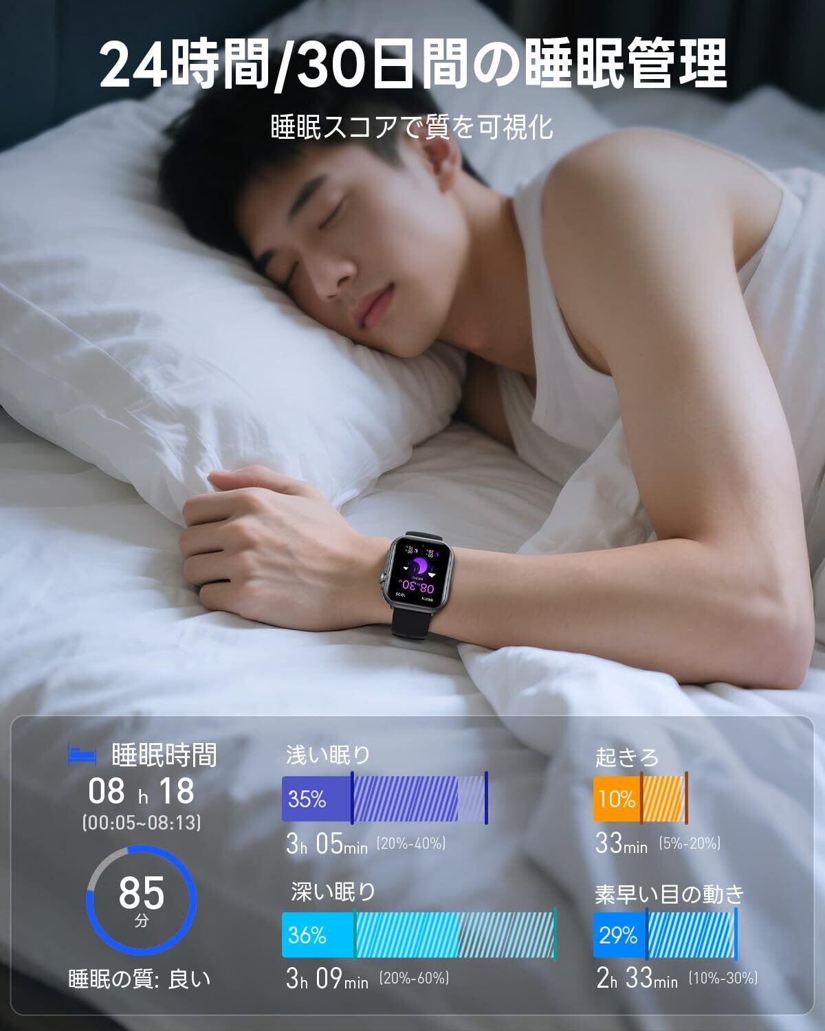 【120種類のスポーツモード&IP68防水・多機能状況管理】本スマートウォッチにランニング、ウォーキング、サイクリングをはじめとした120種類のスポーツモードを搭載し、日々の運動をしっかり記録・サポートします。IP68の防水・防塵仕様で、手洗いや汗をかく場面でも安心してご使用いただけます(※高温の浴場・サウナ・温泉での使用は不可)。状況管理機能も充実しており、心拍数・血中酸素の常時モニタリング、座りすぎ・水分補給リマインダー、呼吸トレーニング機能も搭載してます。さらに、睡眠管理により30日間の睡眠状態を記録・可視化。女性向けの月経周期管理機能も備え、日常の健康をトータルでサポートします。