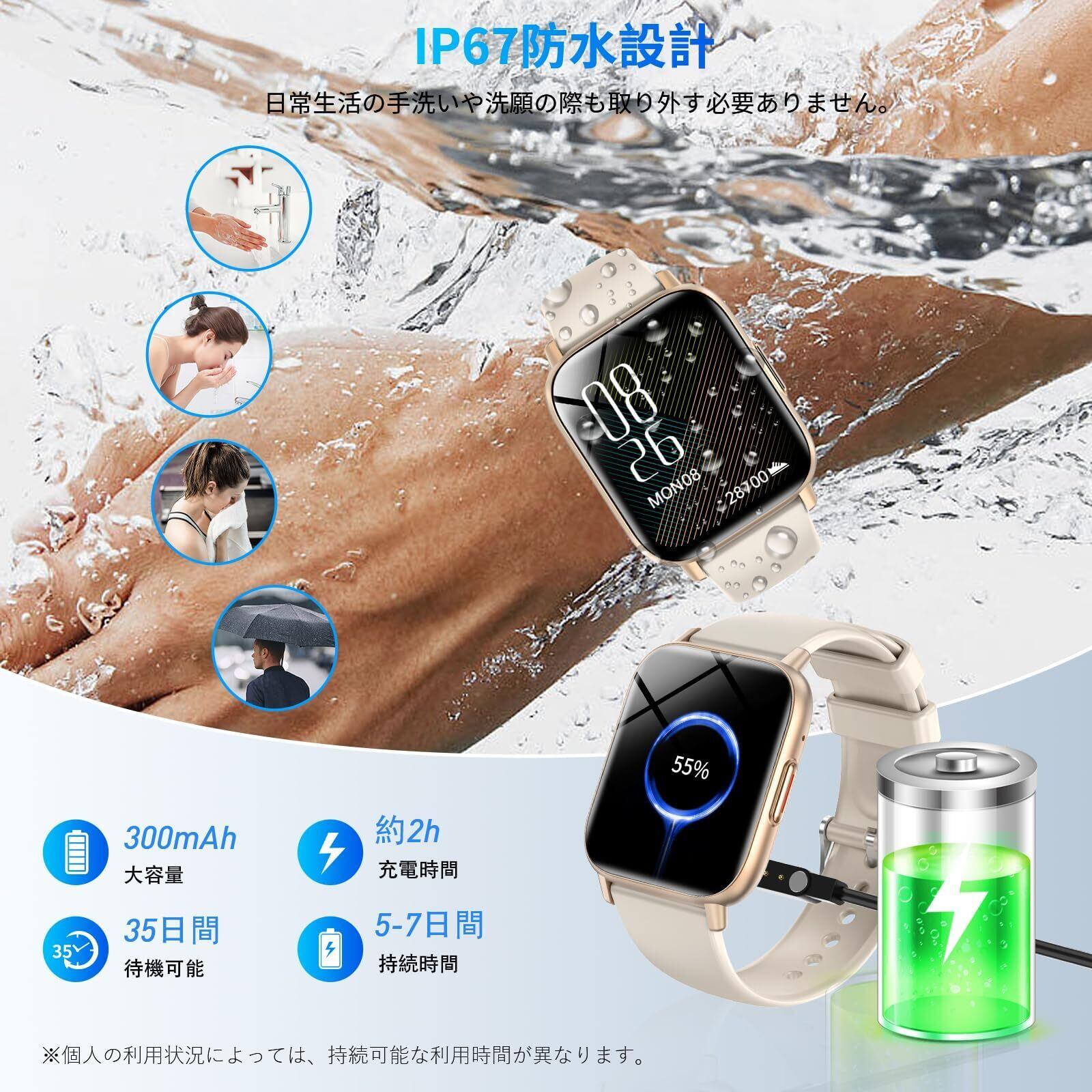 【耐久バッテリー &IP67防水】このスマートウォッチは300mAh大容量バッテリーを搭載され、 2時間の充電で、約5-7日間の使用時間と36日間の待機時間を提供し。頻繁に充電する手間が省けます。付属の磁気充電ケーブルをスマートウォッチの充電端子に接続すると充電開始となります。(個人の利用状況によっては、持続可能な利用時間が異なります) 。IP67級の防水及び防塵性能を持っており、汗、雨、水しぶきに対応しています。日常生活の手洗いや洗顔の際も取り外す必要がありません。※お風呂、サウナ、温泉水や温泉の湯気及び高い水圧等の高温環境では着用しないでください。