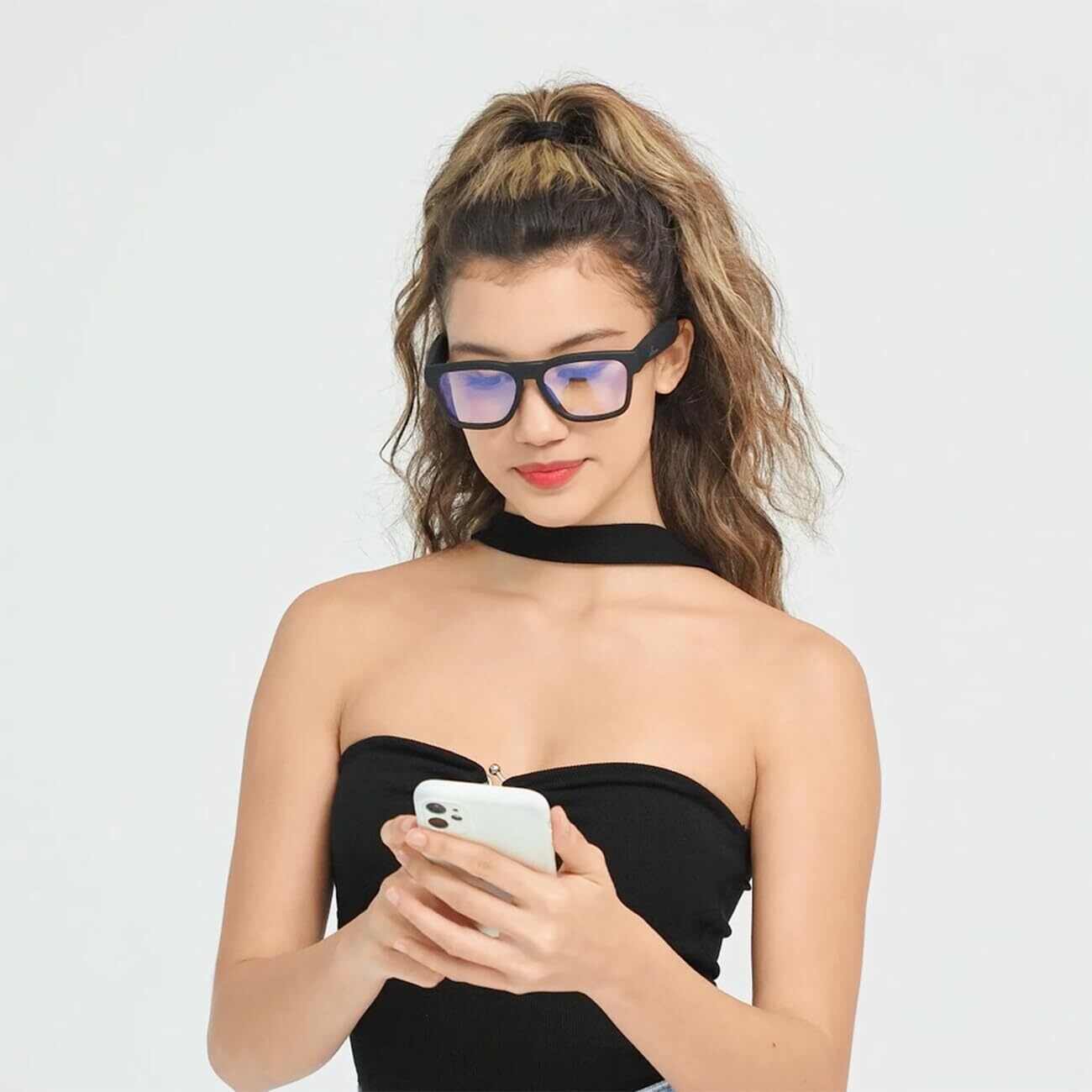 [OhO sunshine] Bluetoothメガネ 音声制御 オープンイヤースタイル スマートメガネ 音楽と通話の聞き取り UV400保護レンズ 大人 ブラックフレーム - ブルーライトブロックレンズ
