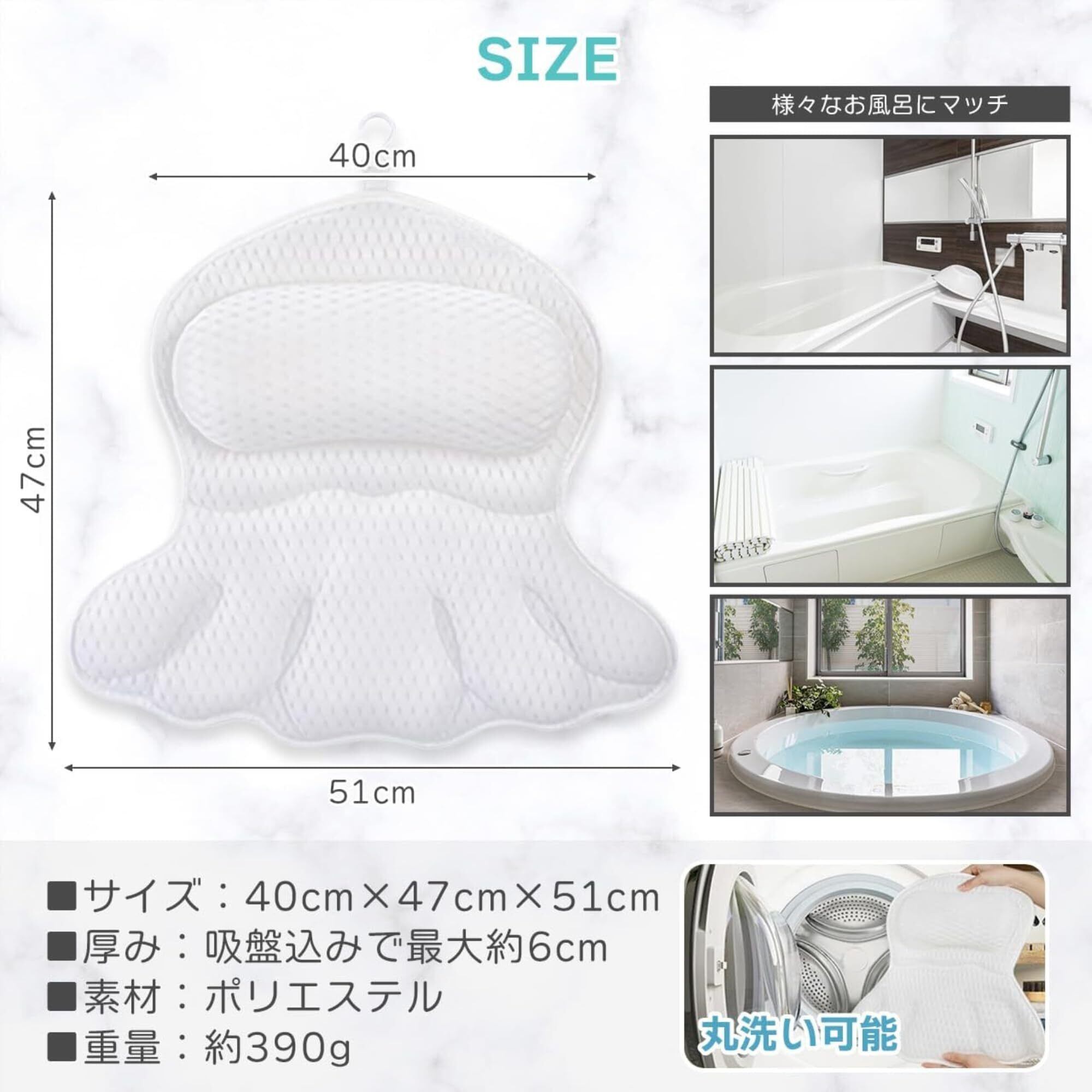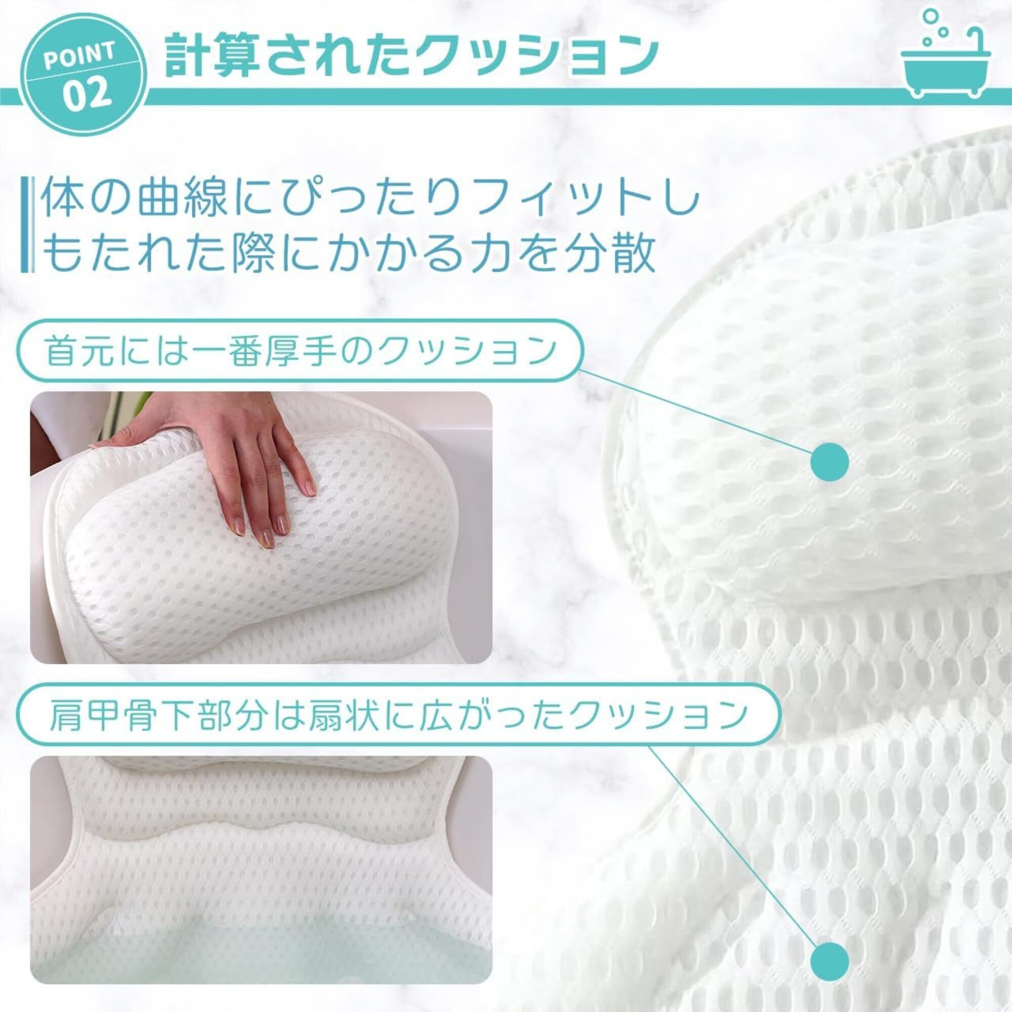 【滑り止め吸盤で安心】強力な吸盤がしっかりと浴槽に固定され、滑りを防止。頭や首、肩をしっかりと支え、安心してリラックスできます。まるで本物の枕のような質感で、極上のくつろぎをお届けします。