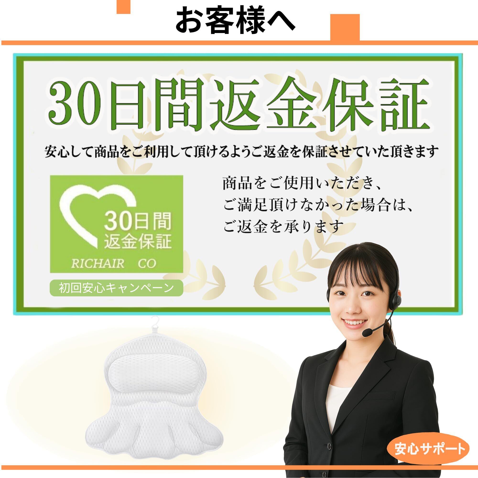 【極上のリラックス体験をお風呂で】 RICHARバスピローは、後頭部から肩、背中までやさしく包み込むデザイン。まるでスパにいるような極上のリラックス感を、ご自宅のお風呂で気軽に体験できます。広範囲をサポートすることで首や肩の負担を和らげ、日々の疲れを癒します。 【通気性抜群の4Dエアメッシュ素材】 最新の4Dエアメッシュ生地を採用し、優れた通気性と速乾性を実現。湿気がこもりにくく、カビや雑菌の心配も軽減。丸洗い可能で、常に清潔にご使用いただけます。長時間の入浴でもムレずに快適な使い心地が続きます。 【しっかり固定で安心】 背面には強力な吸盤を搭載。浴槽にしっかり密着し、使用中のズレや滑りを防止します。頭・首・肩をしっかりと支える安定感があり、本物の枕のようなクッション性で極上のくつろぎをサポートします。 【安心の品質】 ご購入から30日間の無料返品付き。不具合や誤納品があった場合も、迅速に対応いたします。安心してお試しいただけます。