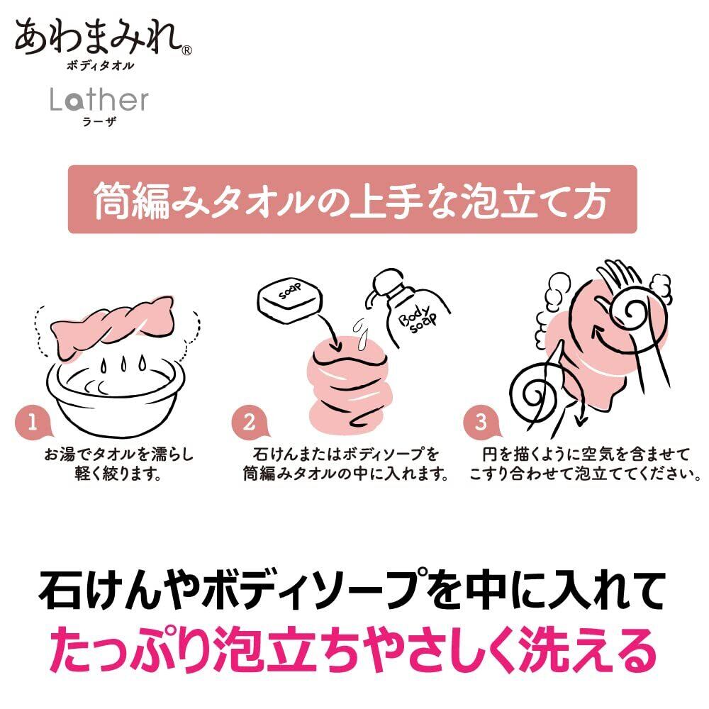 素早く泡立つ筒編み形状タオルに空気を含みやすく、たっぷりの泡立ちボディソープでも、固形石けんでも満足の泡立ち安心の日本製