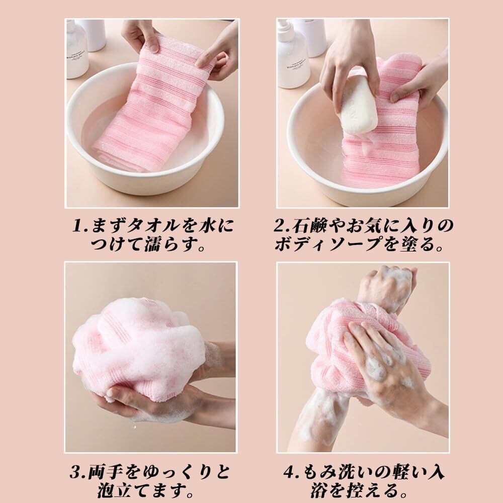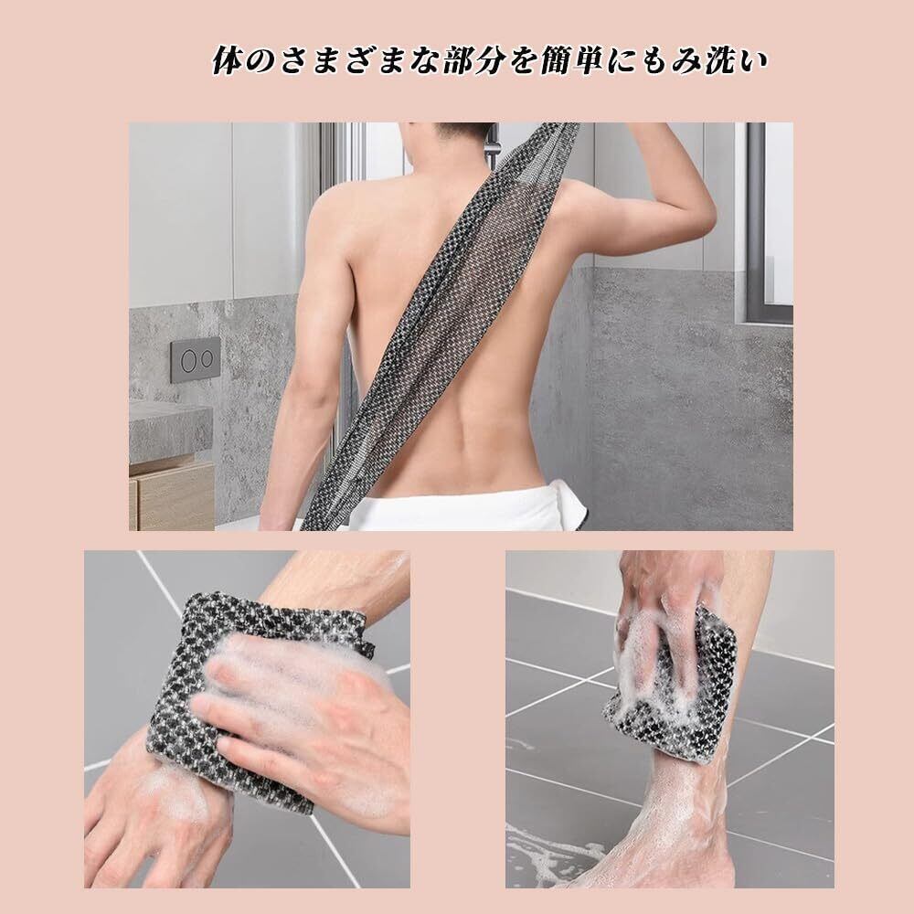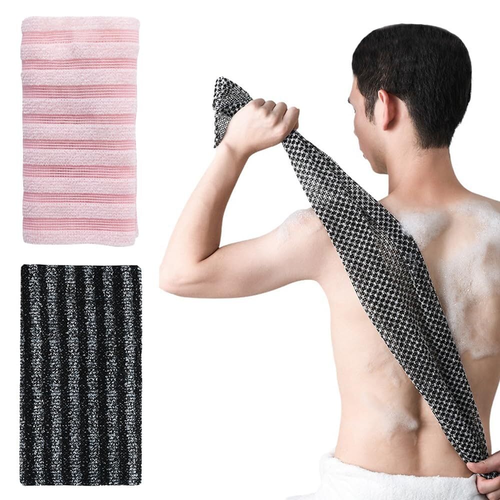 【バックスクラブ用の余分な長さ】ピンクのエクスフォリエイティング・タオルのサイズは約25*100cm、黒の約21*100cm。超ロングデザインと大カバーで、タオルを好きなように持ち、肘や背中など手の届きにくい部分を深く清潔にし、角質を除去することができます。